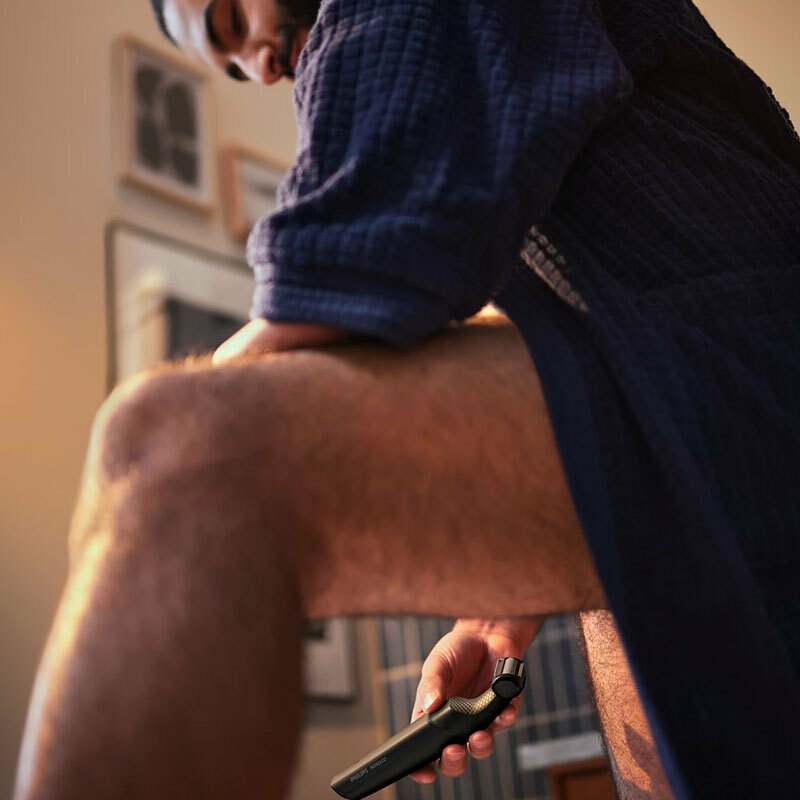 Wet & Dry uso en la ducha 1 Peine-guía para el cuerpo (3 mm) - Sin necesidad de aceite Lámina con dos precortadores Sistema de protección de la piel Comodidad en las zonas sensibles 1 Ajuste de longitud fijo
