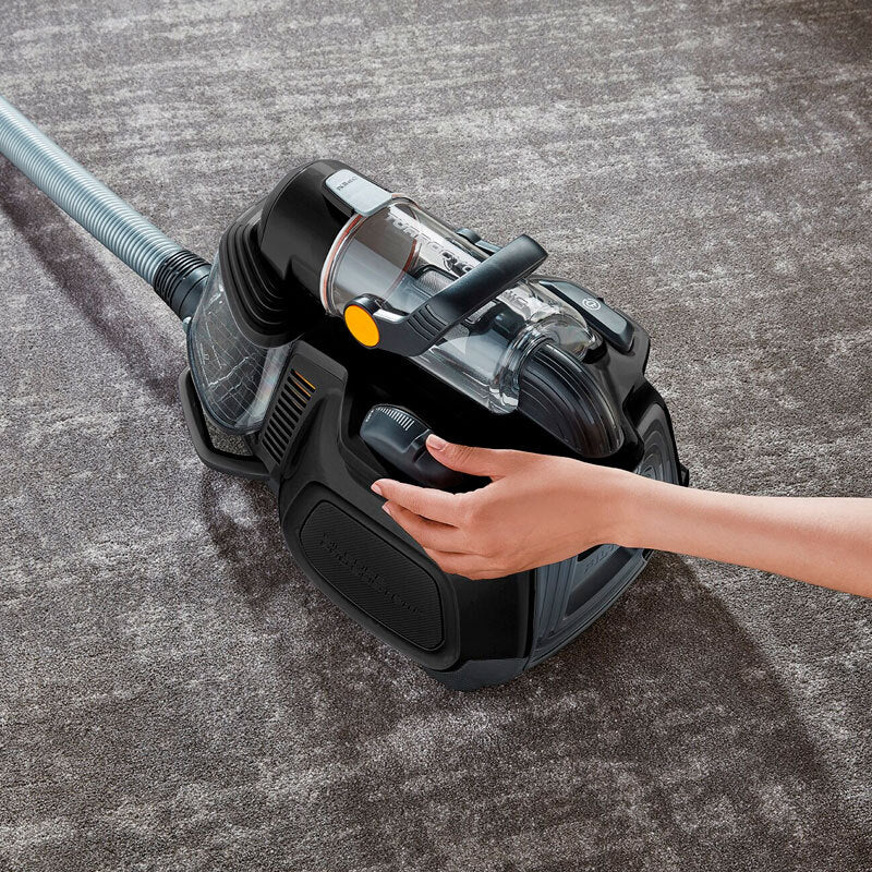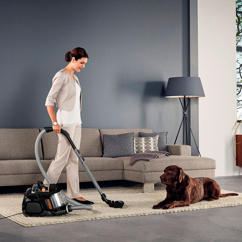 Posición parking horizontal + vertical Control con mando giratorio Filtro de salida: Higiénico lavable E12 Regulación de potencia Ranuras de parking integradas Cepillos: Magnético Silencioso, Parketto Pro sistema de bloqueo Asa de transporte