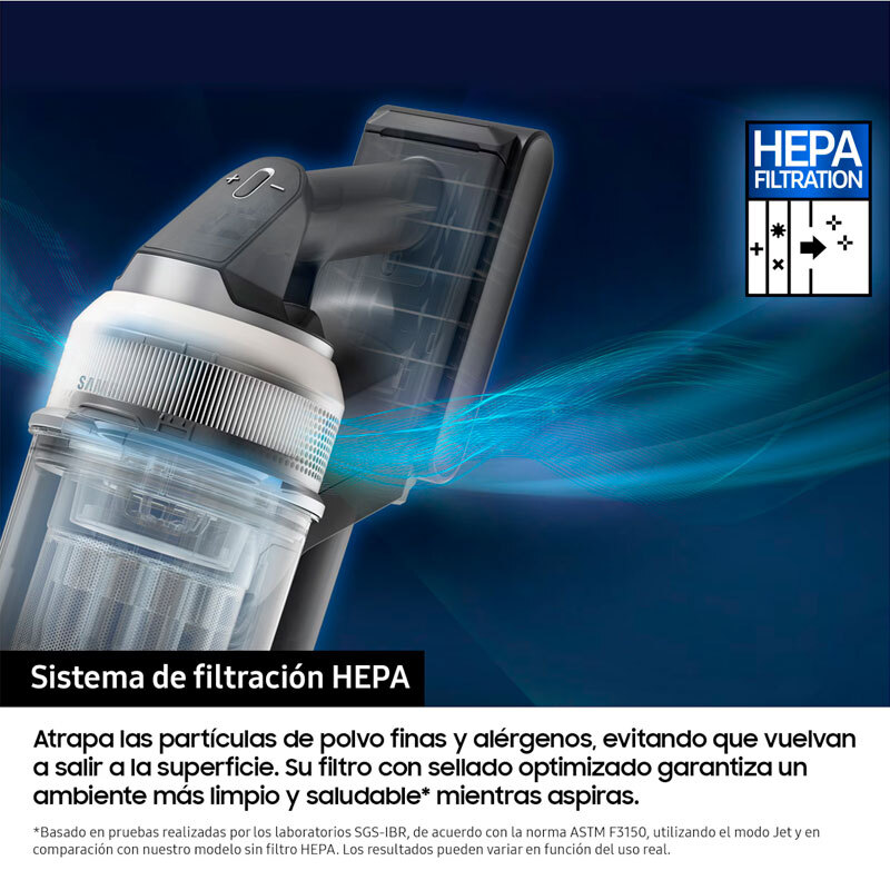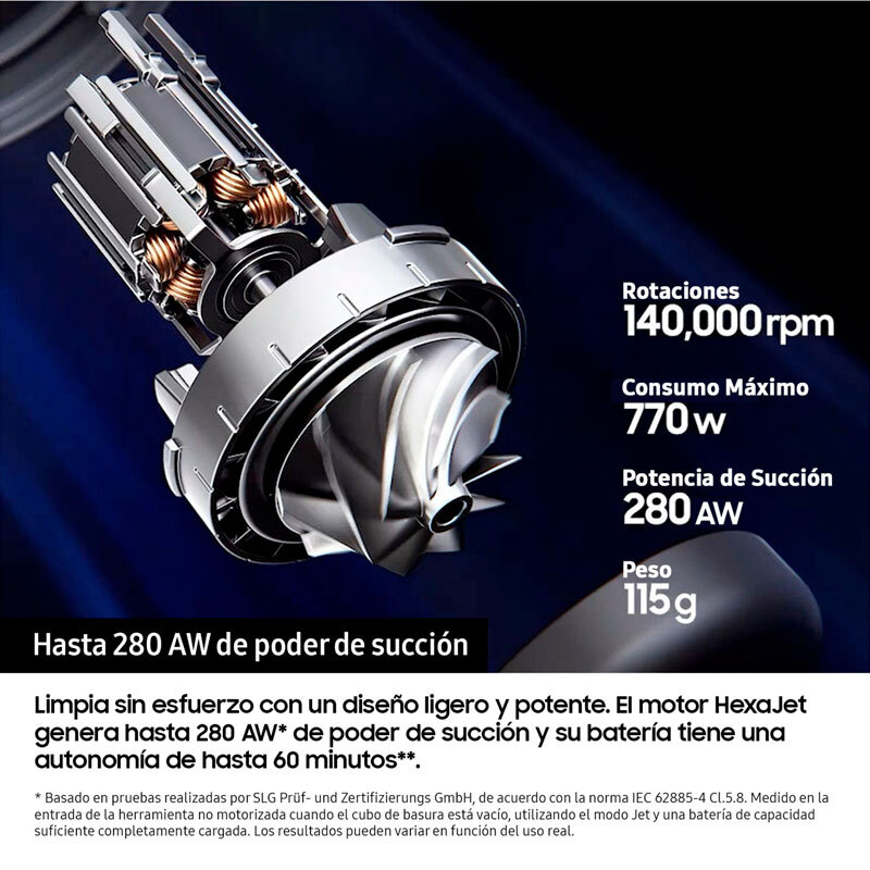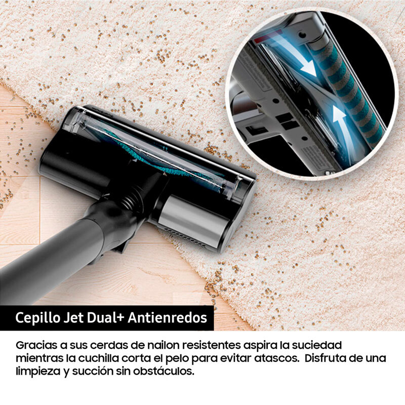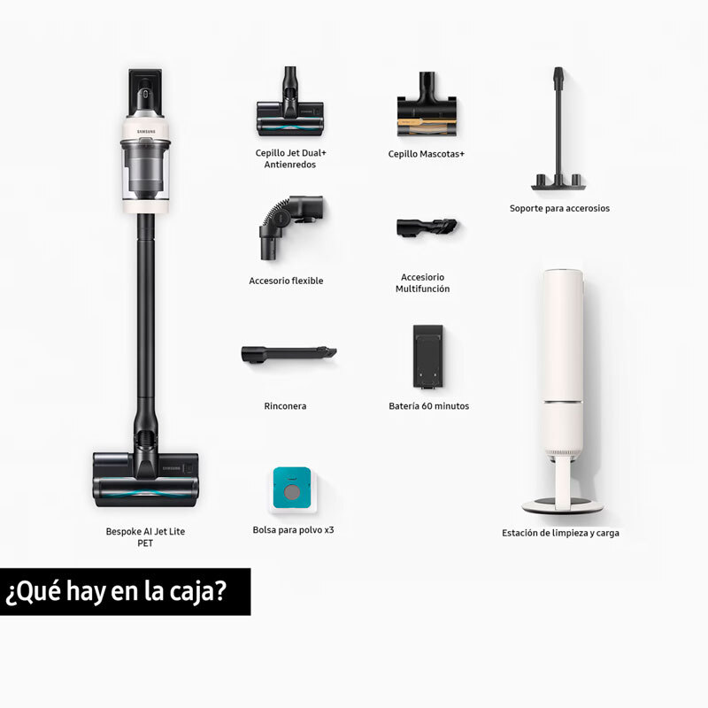 Hasta 280 AW de poder de succión Limpia de forma eficaz y sin esfuerzo, con un diseño ligero y potente. Su motor HexaJet genera una potencia de succión de hasta 280 AW para una limpieza intensiva. Cuenta con una batería de hasta 60 minutos de autonomía - Limpia sin esfuerzo Diseño ligero. Limpia hasta el último rincón de tu casa sin esfuerzo gracias a su diseño ergonómico, un 21% más ligero que las aspiradoras convencionales - Limpieza Inteligente Limpieza Inteligente: AI Cleaning Mode 2.0. Gracias al AI Cleaning Mode 2.0, la aspiradora analiza las diferentes superficies y ajusta automáticamente la potencia de succión y la velocidad del cepillo. Utilizando el cepillo Active Dual se reduce el consumo de batería hasta un 14% y con el cepillo Slim LED+ en hasta un 21% - Un ambiente más limpio y saludable Sistema de filtración HEPA. Atrapa las partículas de polvo finas y alérgenos, evitando que vuelvan a salir a la superficie. Su filtro con sellado optimizado garantiza un ambiente más limpio y saludable mientras aspiras. - Limpieza sin contacto con el polvo Estación de limpieza y carga. Vacía y carga tu aspiradora automáticamente al colocarla en la estación, elimina hasta la suciedad atascada. Con cierre hermético de bolsa - Motor HexaJet El motor HexaJet, ligero y potente, incorpora un diseño innovador que mejora el caudal de aire para un rendimiento de limpieza eficaz. Cuenta con una garantía de 10 años en los motores Digital Inverter y proporciona hasta 280 AW de poder de succión. - Batería extraible Limpia tu casa de esquina a esquina con hasta 60 minutos de autonomía. Además, carga una segunda batería para una limpieza más profunda. - Cepillo Jet Dual+ Antienredos Gracias a sus cerdas de nailon resistentes aspira la suciedad mientras la cuchilla corta el pelo para evitar atascos. Disfruta de una limpieza y succión sin obstáculos. - Multi Cyclone Disfruta de un aire más limpio y un gran poder de succión con la alta eficiencia del Jet Cyclone. Su estructura con 9 ciclones y 27 entradas de aire minimizan la pérdida de succión. - Smart WiFi Smart Wi-Fi te permite ajustar y gestionar funciones y configuraciones de la aspiradora a través de la app SmartThings. Su autodiagnóstico inteligente también comprueba su estado y proporciona una guía de mantenimiento personalizada. También te permite recibir llamadas y mensajes en la pantalla. - Deposito lavable Mantén el depósito limpio y vacía la aspiradora fácilmente. Todo el depósito de 0.5 litros, incluido el sistema multiciclón, es totalmente lavable. Se extrae fácilmente sin necesidad de separarlo del tubo. Después de lavarlo, seca el filtro del polvo durante más de 24 horas antes de volver a usarlo. - Pantalla digital LCD Visualiza el nivel de succión y el tiempo de batería restante y controla la aspiradora de forma intuitiva gracias a esta pantalla con configuración disponible por idioma. Además, te da alertas sobre problemas en el proceso de aspiración y te ofrece soluciones. - Tubo telescópico Regula la longitud del tubo y adáptalo a tu altura con 3 niveles para disfrutar de una postura ergonómica y limpiar sin esfuerzo con la máxima comodidad de uso. - Soporte para accesorios Guarda los cepillos y accesorios de forma ordenada. También incluye un kit de carga de baterías adicional para que puedas cargar baterías cuando lo necesites. - Cepillo Mascotas+ Cepillo especializado en recoger pelos de mascotas finos y difíciles de atrapar. En forma de V, recoge los pelos en el centro para poder cortarlos fácilmente. - Rinconera Accede a los sitios más recónditos y limpia en profundidad, gracias a la herramienta para rincones de largo alcance. Se extiende hasta 43 cm más para llegar a dónde necesitas. - Accesorio multifuncion Cepillo especial 2 en 1 para limpiar tanto tapicerías como para quitar el polvo. Ideal para una amplia variedad de superficies. - Accesorio flexible Limpia sin problemas lugares de difícil acceso. Se puede doblar hasta 90º sin perder potencia de succión.