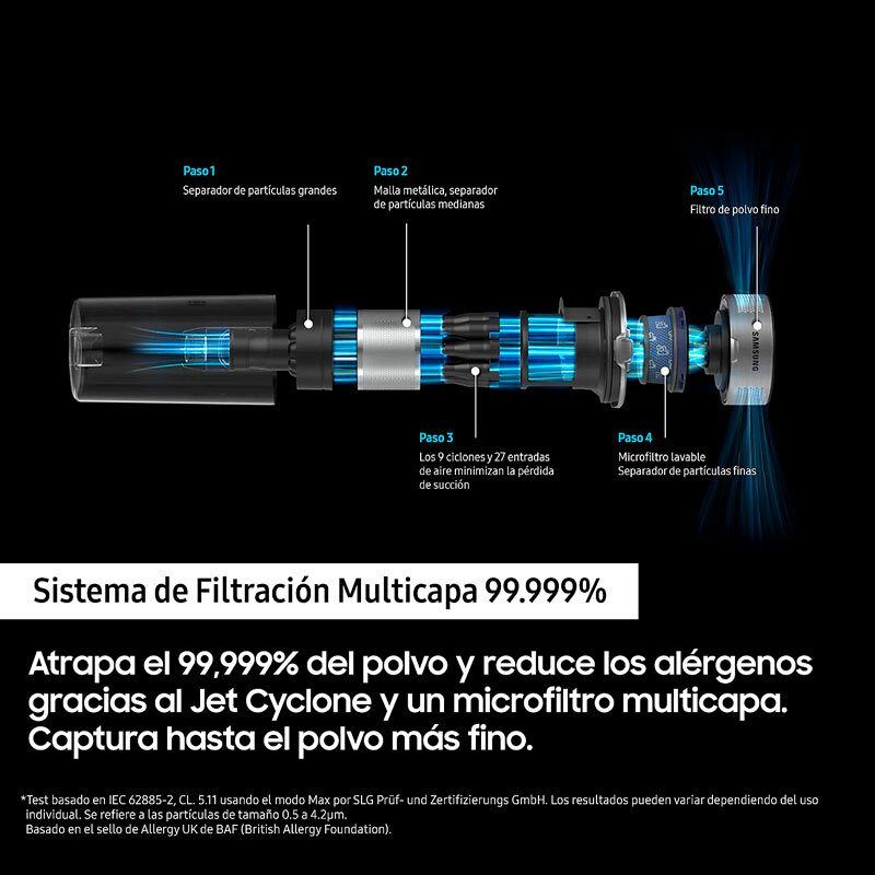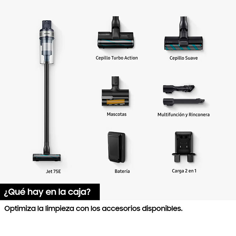 *¡¡Limpieza potenciada:!! Limpia varios tipos de suelo con la máxima potencia. El Motor Digital Inverter y el diseño aerodinámico optimizan el flujo de aire, mientras que Jet Cyclone atrapa de manera eficiente hasta las partículas de polvo más finas. *¡¡Motor Digital Inverter:!! Limpia de forma más eficaz con una potencia de succión de hasta 200AW. El motor Digital Inverter optimiza el flujo de aire ofreciendo una gran potencia de hasta 550AW, alta eficiencia energética y hasta 200AW de succión. *¡¡Jet Cyclone:!! Disfruta de un aire más limpio y una potencia de succión extrema durante más tiempo con la estructura multiciclónica de alta eficiencia del sistema Jet Cyclone. Las 27 entradas de aire de Jet Cyclone crean una ruta de aire óptima, minimizando así la pérdida de succión. También separa higiénicamente las partículas finas de polvo del aire. *¡¡Sistema de Filtración Multicapa 99.999%:!! Atrapa el 99,999% del polvo y reduce los alérgenos gracias al Jet Cyclone y un microfiltro multicapa. Captura hasta el polvo más fino. *¡¡Diseño ligero:!! Limpia tu hogar sin esfuerzo gracias a un diseño más liviano que garantiza la máxima usabilidad y reduce la tensión en tu muñeca. El cuerpo de la aspiradora pesa solo 1,66 kg, lo que es un 12% más ligero. Podrás limpiar fácilmente toda tu casa. *¡¡Batería extraible de larga duración:!! Limpia tu casa de esquina a esquina con hasta 60 minutos de autonomía. Además, carga una segunda batería para una limpieza más profunda *¡¡Deposito lavable:!! Tanto el depósito de polvo, como el sistema multiciclón, es resistente al agua, por lo que puedes lavarlo sin preocupaciones. Además, puedes separar todas sus piezas para que sea mucho más fácil de limpiar. *¡¡Display LED:!! Gracias a esta pantalla, podrás comprobar los ajustes, nivel de potencia y el tipo de cepillo que tienes puesto. Además, te avisará si hay algún problema o bloqueo. *¡¡Estación de carga 2 en 1:!! Almacena y carga tu aspirador de manera más flexible con la estación de carga 2 en 1, que se ajusta fácilmente a cualquier hogar. Si deseas ahorrar espacio, puedes montarlo en la pared, o puedes usarlo como un cargador independiente, por lo que simplemente podrás quitar la batería y cargarla en cual *¡¡Cepillo turbo action:!! Recoge partículas finas de polvo en alfombras y suelos duros con el cepillo Turbo Action. Gira alrededor de 3.750 veces por minuto. Un cabezal giratorio de 180 grados te permite cambiar de dirección fácilmente y limpiar cada esquina. *¡¡Cepillo para mascotas:!! Olvida el engorro de retirar el pelo de mascota más rebelde. El cepillo Pet Tool, compacto y fácil de manejar, está optimizado para recoger pelo de mascota fino y difícil de atrapar con su combinación de boquilla de goma y cerdas. *¡¡Cepillo rinconero:!! Llega hasta las grietas o los sitios más pequeños, como el hueco de detrás del sofá, sin dejar ni una mota de polvo gracias a la herramienta para grietas de largo alcance, que se extiende hasta 43 cm más para llegar a todos los rincones. *¡¡Cepillo multifunción:!! Limpia cualquier tipo de mueble de manera efectiva. Con este accesorio para tapicería que recoge suciedad y que también se convierte en un cepillo para el polvo, siendo así ideal para usar en una gran variedad de superficies.