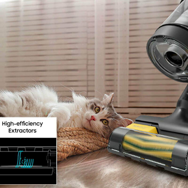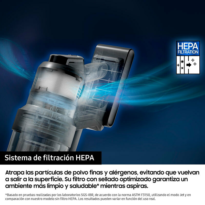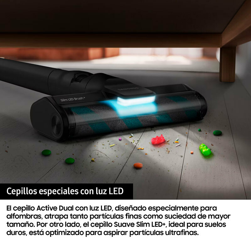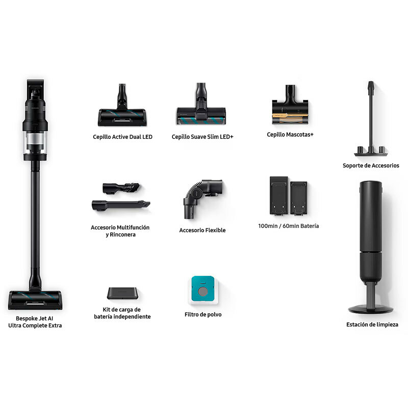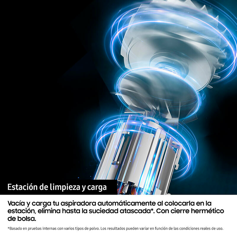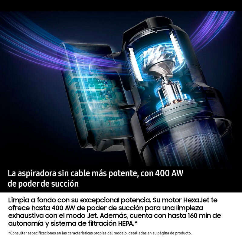 La aspiradora sin cable más potente, con 400 AW de poder de succión Su motor HexaJet ofrece una potencia de succión de hasta 400 AW utilizando el modo Jet, la máxima en aspiración sin cable para una limpieza intensiva y profunda. Cuenta con una autonomía de hasta 160 minutos gracias a sus dos baterías y con el sistema de filtración HEPA. - Limpieza Inteligente: AI Cleaning Mode 2.0 Gracias al AI Cleaning Mode 2.0, la aspiradora analiza las diferentes superficies y ajusta automáticamente la potencia de succión y la velocidad del cepillo. Utilizando el cepillo Active Dual se reduce el consumo de batería hasta un 14% y con el cepillo Slim LED+ en hasta un 21% - Estación de limpieza y carga Vacía y carga tu aspiradora automáticamente al colocarla en la estación, elimina hasta la suciedad atascada. Con cierre hermético de bolsa. - Sistema de filtración HEPA Atrapa las partículas de polvo finas y alérgenos, evitando que vuelvan a salir a la superficie. Su filtro con sellado optimizado garantiza un ambiente más limpio y saludable mientras aspiras. - Motot Hexajet: El motor HexaJet, ligero pero potente, tiene un diseño innovador que mejora su caudal de aire y su eficacia, y una garantía de 10 años para los motores digitales Inverter. Gira hasta 160.000 rpm y proporciona hasta 400 W de succión. - Batería extraible y duradera: Limpia hasta 160 minutos sin parar. Carga una segunda batería, incluida en la caja, mientras estás limpiando y llega hasta el último rincón. Conserva el 70% de su rendimiento original hasta 600 ciclos y tiene una garantía de 2 años - Cepillo Active dual LED: Con iluminación LED integrada, este cepillo permite detectar y limpiar hasta el polvo más fino, incluso en áreas de poca luz. Está especialmente indicado para alfombras, ya que combina dos tipos de cerdas que trabajan simultáneamente para limpiar la suciedad. - Cepillo suave Slim LED: Recoge partículas de polvo finas en suelos duros y grietas, gracias al uso de hilos de plata anti estáticos. Es muy ligero, y dispone de luz LED integrada, lo que permite una limpieza fácil y rápida. - Cepillo mascotas+: Cepillo especializado en recoger pelos de mascotas finos y difíciles de atrapar. Su cepillo en forma de V recoge los pelos en el centro para poder cortarlos fácilmente. - Deposito lavable: Mantén el depósito limpio y vacía la aspiradora fácilmente. Todo el depósito de 0,5 l, incluido el sistema multiciclón, es totalmente lavable. Se extrae fácilmente sin necesidad de separarlo del tubo. - Pantalla digital LCD: Visualiza el nivel de succión, el tiempo de batería restante y controla la aspiradora de forma intuitiva gracias a esta pantalla con configuración disponible por idioma. Además, te da alertas sobre problemas en el proceso de aspiración y te ofrece soluciones. - Soporte para accesorios: Guarda los cepillos y accesorios de forma ordenada. También incluye un kit de carga de baterías adicional para que puedas cargar baterías cuando lo necesites. - Accesorios (rinconera, accesorio multifunción y accesorio flexible)