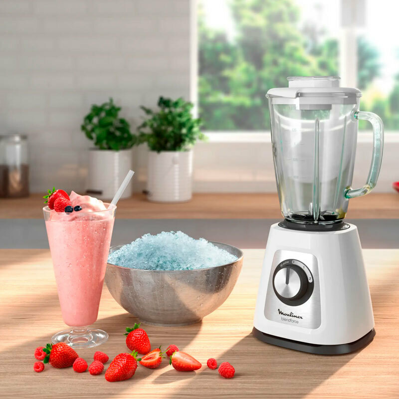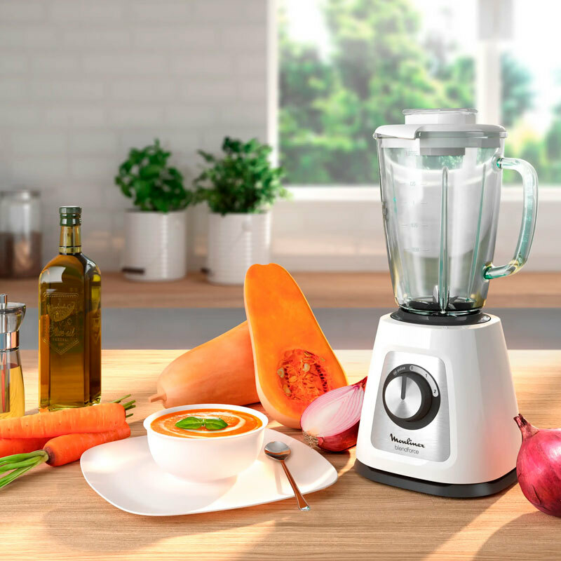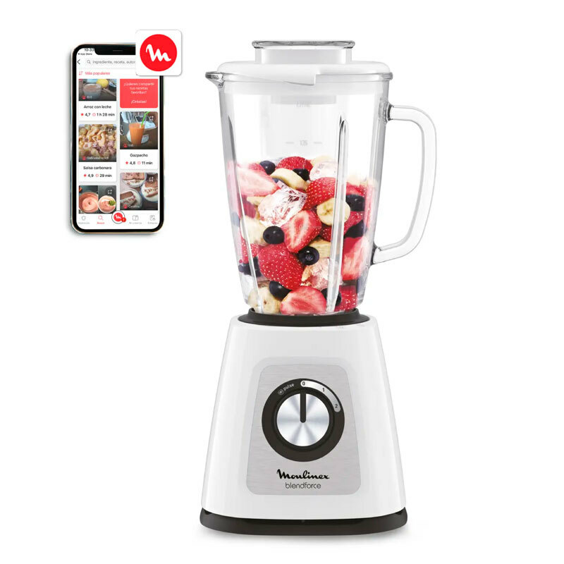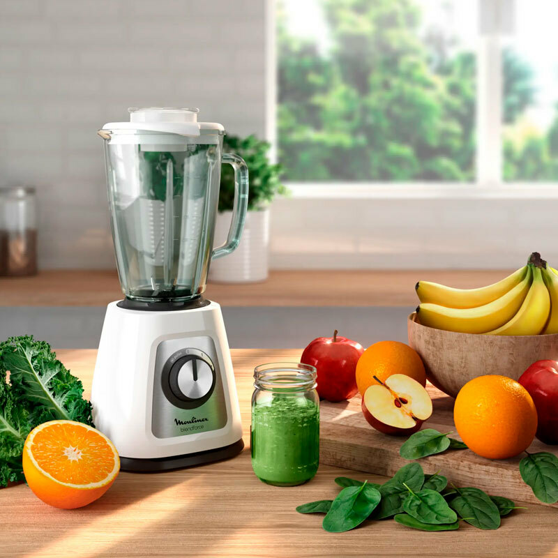 Bate sin esfuerzo a diario: Gracias a la tecnología de bloqueo inteligente Smart Lock, podrás batir con total seguridad y comodidad. - Acción 1: bloqueo fácil Nuevo sistema de bloqueo externo para un cierre más cómodo. (un 40 % más fácil con respecto a la LM300) - Acción 2: seguridad Nuevo sistema de bloqueo automático en la base para mejorar la seguridad evitando que las cuchillas se muevan al colocar la jarra. - Acción 3: limpieza fácil Nuevo sistema de clic para separar en dos el soporte de las cuchillas y facilitar su limpieza. - Batidora potente Una potente batidora de 800 W con 4 cuchillas, para un resultado perfecto, rápido y sin atascos. - Jarra de gran capacidad y diseño elegante y funcional Vaso de 1,75 L de cristal termorresistente (hasta 80 °C) - Batidora de vaso Blendforce de Moulinex: procesa tus alimentos en un abrir y cerra de ojos La potencia de Blendforce ofrece grandes resultados con muy poco esfuerzo. Esta batidora de vaso de 800 W cuenta con un innovador sistema de refrigeración que optimiza la circulación del aire alrededor del motor, aumentando así su durabilidad y evitando que se sobrecaliente, para que puedas usarla durante 3 minutos sin descanso. Gracias a las 3 acciones de su tecnología de bloqueo inteligente, puedes usar la batidora a diario sin complicaciones. Acción 1: bloqueo fácil: con un nuevo sistema de bloqueo externo para cerrar la batidora más cómodamente (un 40 % más fácil). Acción 2: seguridad: nuevo sistema de bloqueo automático en la base para mejorar la seguridad evitando que las cuchillas se muevan al colocar la jarra. Acción 3: limpieza fácil: nuevo sistema de clic para separar en dos el soporte de las cuchillas y facilitar su limpieza. La batidora de vaso es fácil y cómoda de usar, ya que tiene una textura en relieve alrededor del botón giratorio para facilitar su movimiento, un agarre ergonómico, natural e intuitivo y ventosas en la base curva para mejorar su estabilidad. Con una gran capacidad (hasta 1,75 L), esta batidora de vaso es perfecta para cualquier ocasión e incluye un vaso medidor que te dará un extra de precisión. Gracias a su vaso de cristal termorresistente, podrás realizar fácilmente una amplia gama de preparaciones frías y calientes. Descubre una gran variedad de opciones: smoothies, sopas, salsas, pastas para untar, granizados, etc., y consigue unos resultados excelentes y deliciosos. Comparado con la batidora LM300 de Moulinex