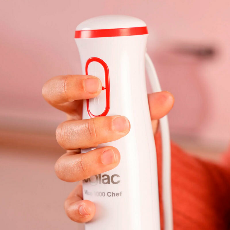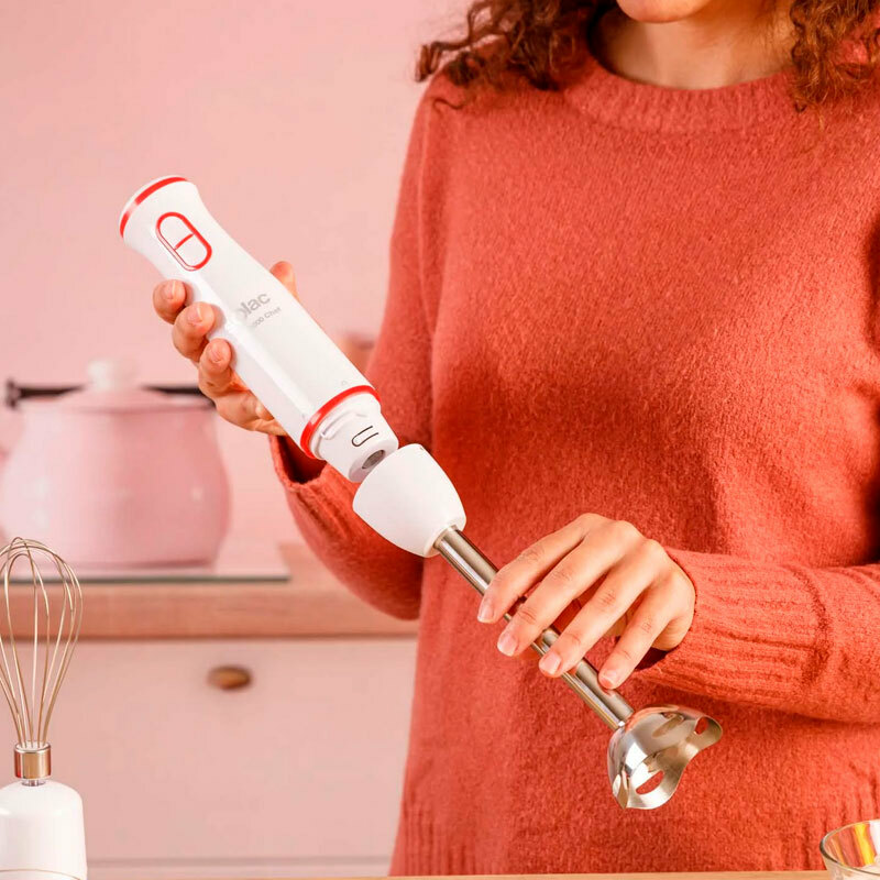 2 Velocidades Función TURBO 2 Cuchillas de alta resistencia de acero inoxidable Varilla de Acero inoxidable Desmontable Cuerpo de plástico Diseño ergonómico Apto lavavajillas: Varilla y accesorios