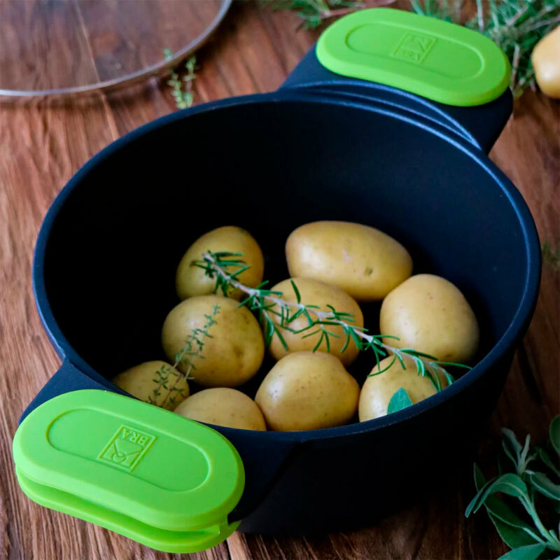 Revestimiento antiadherente tricapa Teflón Innovations 100% libre de PFOA. Fondo full induction compatible con todas las fuentes de calor incluida la inducción. Cuerpo apto para horno hasta 220ºC (usar en el horno sin la tapa de cristal y las asas de silicona). Incluye tapa de cristal y asas de silicona.