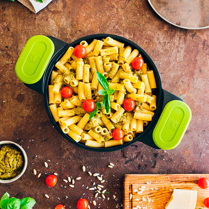 Revestimiento antiadherente tricapa Teflón Innovations 100% libre de PFOA. Fondo full induction compatible con todas las fuentes de calor incluida la inducción. Cuerpo apto para horno hasta 220ºC (usar en el horno sin la tapa de cristal y las asas de silicona). Incluye tapa de cristal y asas de silicona.