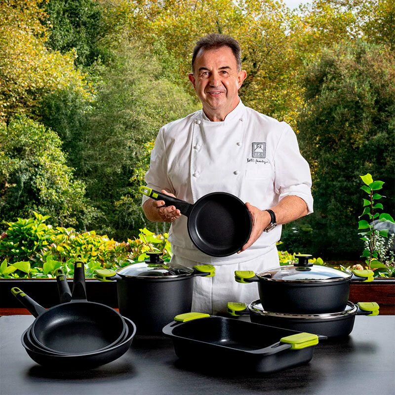 Revestimiento antiadherente tricapa Teflón Innovations 100% libre de PFOA. Fondo full induction compatible con todas las fuentes de calor incluida la inducción. Cuerpo apto para horno hasta 220ºC (usar en el horno sin la tapa de cristal y las asas de silicona). Incluye tapa de cristal y asas de silicona.