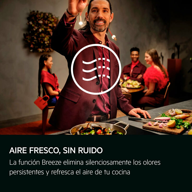 Máximo rendimiento, mínimo ruido: La campana SilenceTech 7000 libera tu cocina de los olores indeseados mientras mantiene el ruido de la campana al mínimo. Con su avanzada tecnología, esta campana extractora te ayuda a crear el ambiente perfecto en tu hogar. - SilenceTech. El máximo rendimiento y el mínimo ruido: SilenceTech crea un ambiente de cocina tranquilo donde puedes disfrutar de aire fresco mientras cocinas. Esta tecnología innovadora limpia de forma eficaz el aire de la cocina de malos olores no deseados, mientras mantiene los niveles de ruido al mínimo. - Disfruta de los detalles con Pure Illumination: El sistema Pure Illumination de bajo consumo energético proporciona una visibilidad total mientras cocinas. Las luces LED iluminan toda la superficie de cocción, lo que facilita ver cada detalle de la preparación de tus alimentos. - Aire natural, fácil y silenciosamente con la función Breeze: La función Breeze refresca el aire de la cocina mientras la usas a la vez que extrae los olores más persistentes. Come, relájate y atiende a tus invitados en un agradable ambiente de cocina, fácil y silenciosamente. - Hob2Hood®. El compañero perfecto para cocinar. La función Hob²Hood® activa inalámbricamente las luces de la campana cuando enciendes la placa de cocción. Cuando empiezas a cocinar, la velocidad del ventilador se regula en función de los ajustes de calor de la placa. Cocina deliciosos platos sin preocuparte de olores y vapores. - ExtractionTech Pro: alta potencia, frescura excepcional: Experimente una calidad de aire superior en la cocina con la campana extractora ExtractionTech Pro. Equipada con nuestro motor más potente y una opción de velocidad intensiva, extrae de manera eficiente los vapores de la cocina y garantiza un ambiente de cocción excepcionalmente fresco. - Sustituye a DVE5971HG