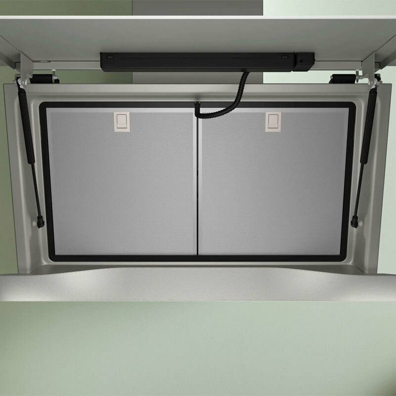 Doble sistema de aspiración y filtrado: frontal e inferior Indicador electrónico de saturación de filtros antigrasa y de carbón activo