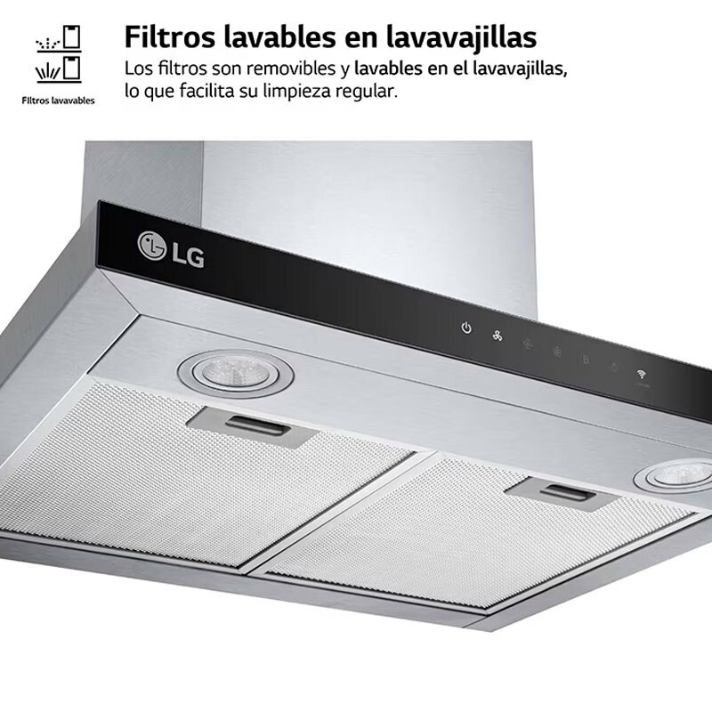 *¡¡Gran poder de extracción:!! 800 m/h. Diseñadas para proporcionar un alto rendimiento de extracción de humos, vapores y olores de la cocina. *¡¡Filtros lavables en el lavavajillas:!! Los filtros son removibles y lavables en el lavavavajillas, lo que facilita su limpieza regular. *¡¡Control intuitivo con 4 niveles de potencia:!! Las campanas de LG vienen con opciones de control intuitivas, como paneles táctiles que permiten ajustar la velocidad de extracción y la iluminación de forma fácil y conveniente. *¡¡Potente iluminación LED:!! Iluminación LED de alta calidad para una mejor visibilidad durante la cocción. *¡¡Conectividad Wifi:!! Conexión Placa - Cocina. Cuando están conectadas, la campana se enciende y ajusta automáticamente a la velocidad de extracción adecuada en función de la configuración de la placa de cocina