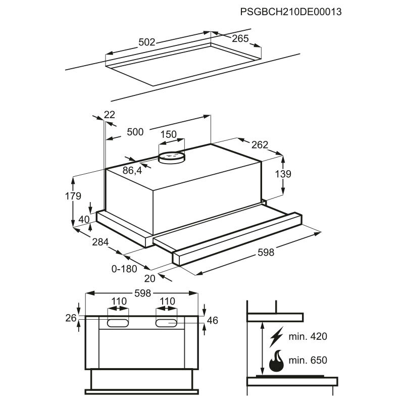 Extracción de aire, o recirculación si se instala con filtro de carbono