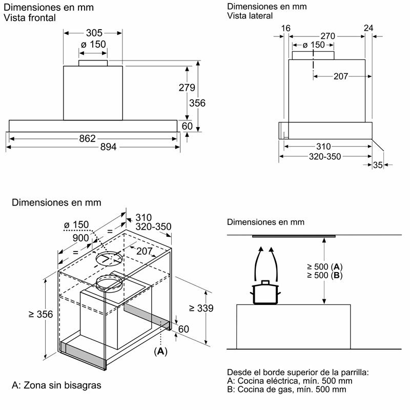 DWZ0IB0U0: set tradicional para instalar en recirculación - DWZ0IB5N0: conducto prolongador de acero inoxidable altura 187-360 mm - DWZ0IB5G0: conducto prolongador de acero inoxidable altura 120 mm.