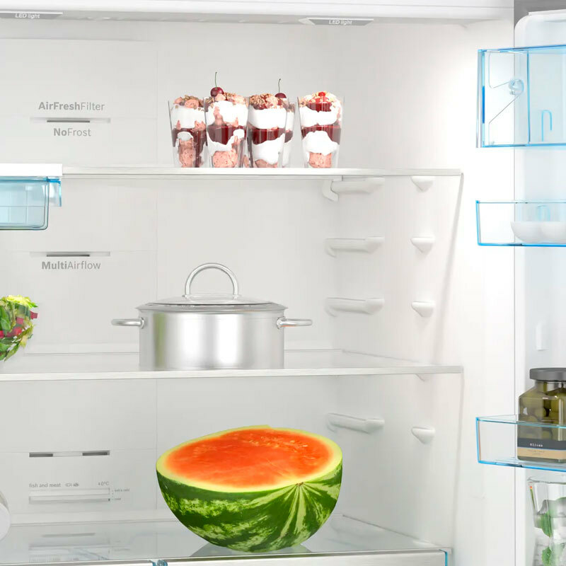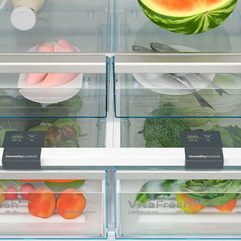 *2 Cajones VitaFresh con control de humedad para frutas y verduras *2 Cajones VitaFresh Plus 0°C con control de temperatura y bandeja de fácil acceso - Carnes y pescados frescos durante más tiempo *Iluminación interior LED, y además, con efecto SoftStart *3 Estantes en el frigorífico de los cuales 2 regulables *4 Balcones en la puerta *3 Hueveras *Botellero