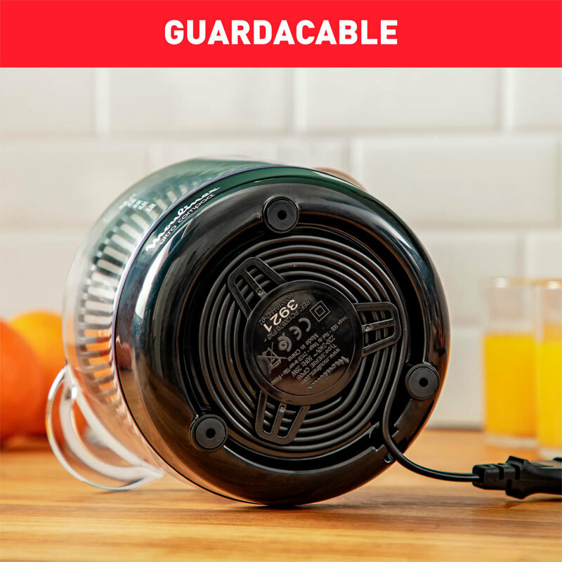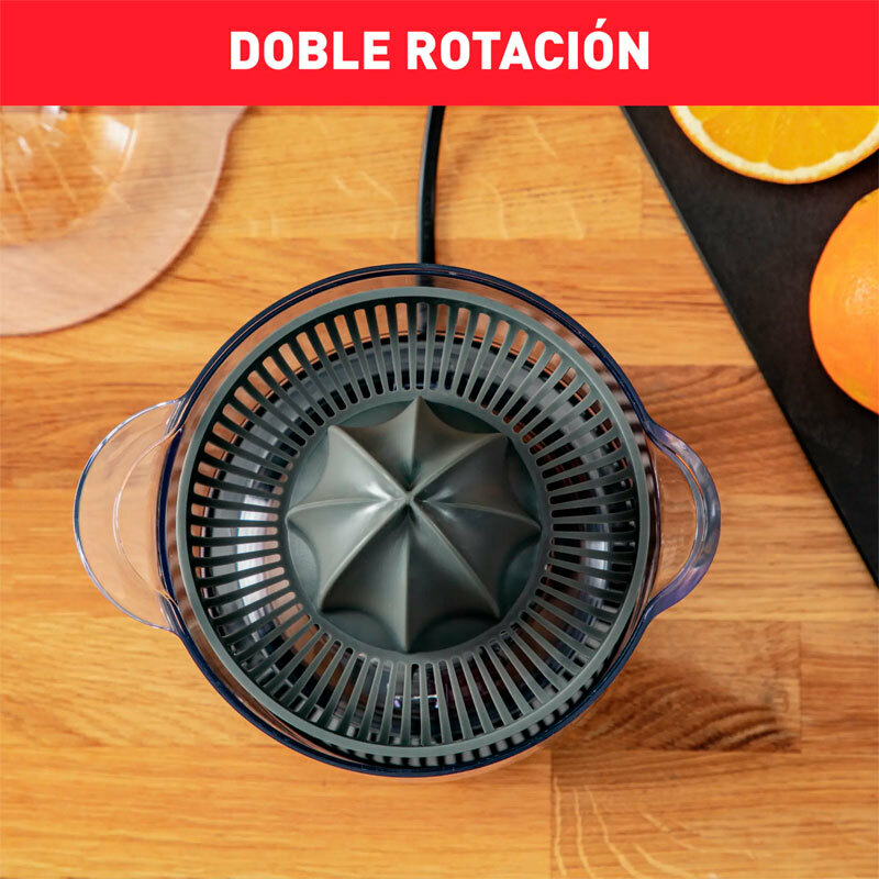 Exprimidor vertido a deposito Capacidad 450 ml de zumo Doble sentido de giro Regulador de pulpa Jarra transparente graduada Doble sentido de rotación Diseño compacto Desmontable para una fácil limpieza Jarra y cono aptos para el lavavajillas Alojamiento para el cable