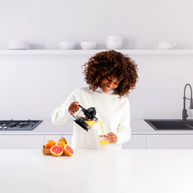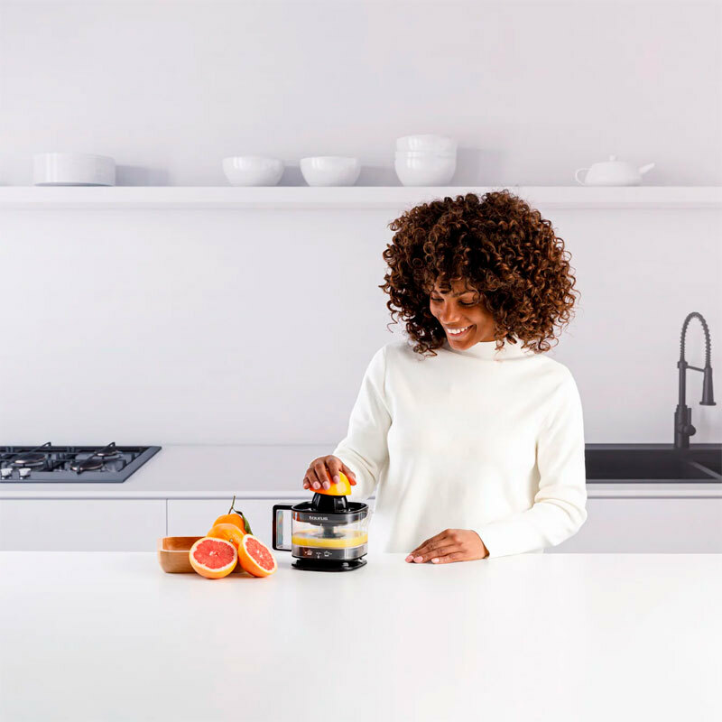 Potencia: 25 W Capacidad 350 ml - Doble sentido de giro Capacidad: 350 ml de zumo Regulador de pulpa Jarra transparente graduada Doble sentido de rotación Diseño compacto Desmontable para una fácil limpieza Jarra y cono aptos para el lavavajillas Alojamiento para el cable