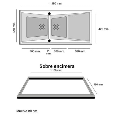 Fregadero Poalgi Kuma 120 2C+E Negro Liso Brillo