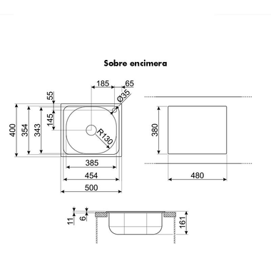Grosor 0,6 mm Radio cubeta 80 mm Rebosadero tradicional Filtro centro de la cubeta de 3.5 1 Agujero precortado a la derecha Diámetro del orificio para grifo: 35 mm