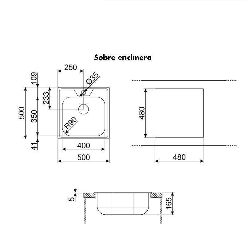 Grosor 0,6 mm Radio cubeta 80 mm Rebosadero tradicional Filtro de pared de 3.5 1 Agujero precortado Diámetro del orificio para grifo: 35 mm