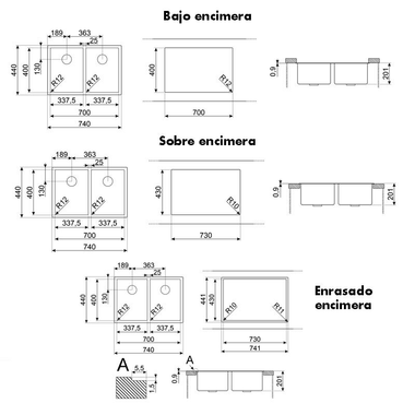 Cubeta, Sifón con conexión para lavavajillas, Ganchos montaje, Silicona. Kit de desagüe integrado