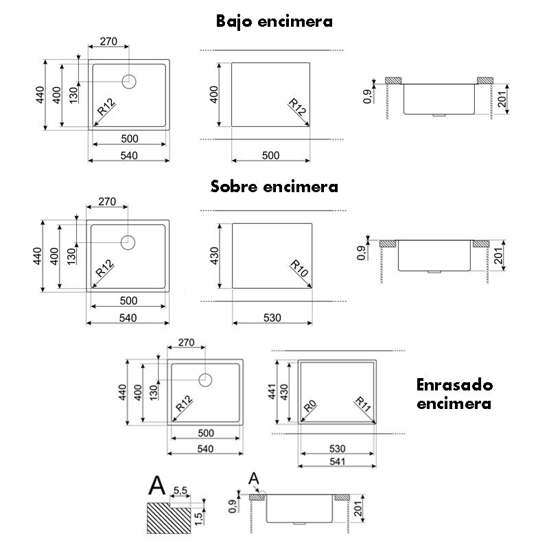 Grosor 1 mm Radio ángulo Cubeta: 12 mm Rebosadero tradicional Filtro de pared de 3.5