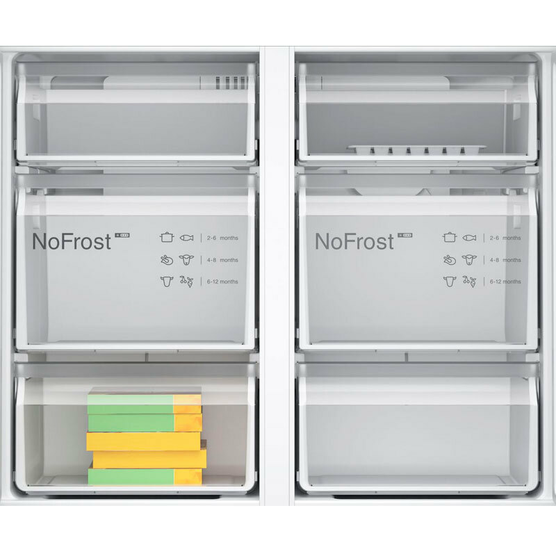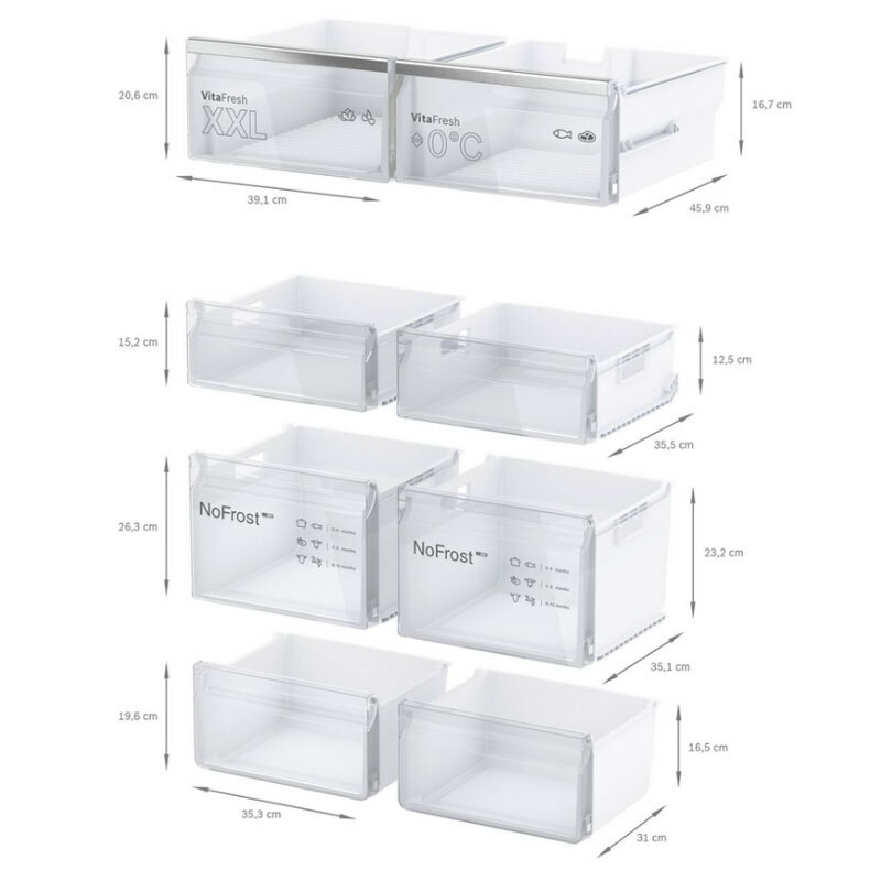 *Capacidad XXL: Amplía la capacidad de tu frigorífico. Si quieres un frigorífico grande pero no tienes demasiado espacio, nuestros modelos con capacidad XXL te ofrecen la solución. Son solo un poco más anchos que los frigoríficos convencionales y, a cambio, en su interior caben bandejas de horno, sandías y otros alimentos voluminosos. Además, tendrás más flexibilidad para almacenar los alimentos como quieras y tenerlos siempre a la vista. *Home Connect: Con la aplicación Home Connect tendrás siempre a mano recomendaciones para conservar los alimentos, información nutricional y consejos para un mantenimiento óptimo de los alimentos. De este modo, podrás elegir las mejores condiciones para cada producto. *NoFrost: no pierdas más tiempo descongelando el frigorífico. La Edad de Hielo se acabó NoFrost mantiene un flujo constante de aire seco en todo el frigorífico o congelador que evita que se forme escarcha. Así podrás olvidarte para siempre del molesto proceso de descongelación. *VitaFresh XXL 0 °C: Espacio adicional para tus alimentos frescos. El espacioso sistema VitaFresh XXL 0 °C ofrece el entorno de almacenamiento ideal para los alimentos frescos. Mantiene una temperatura más baja para las carnes y pescados, y un cajón con mayor nivel de humedad que conserva las frutas y verduras perfectamente frescas. *VitaFresh XXL: El cajón VitaFresh con mecanismo de control de humedad ajustable mantiene la frescura de sus frutas y verduras por mucho más tiempo.