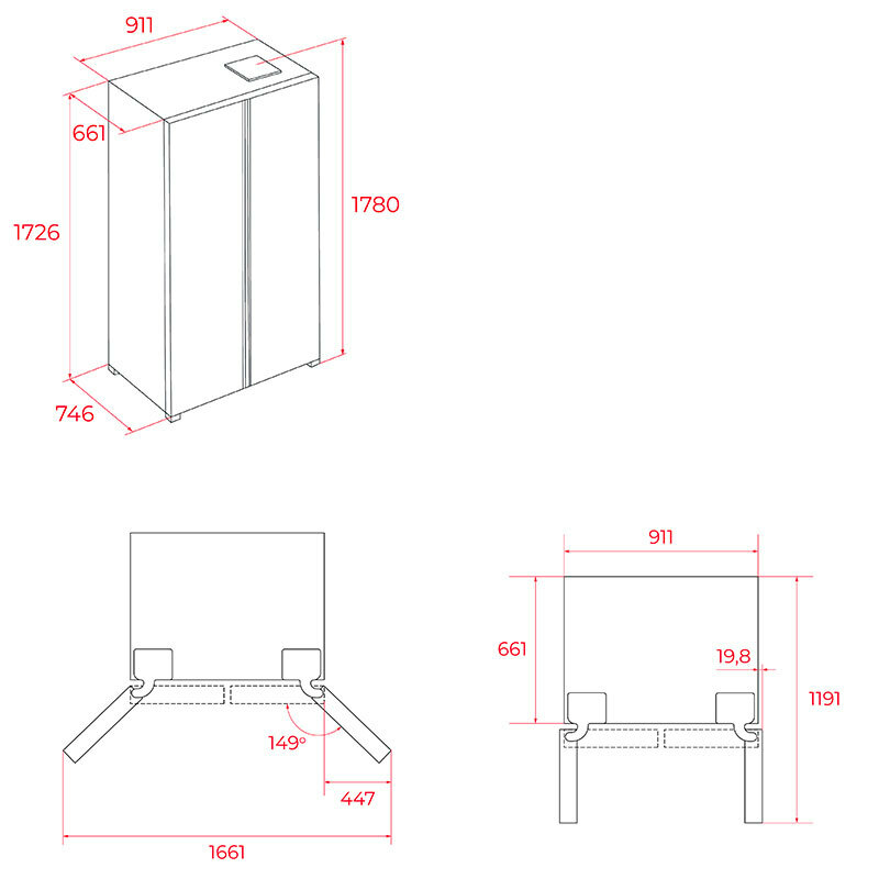 Ruedas traseras de desplazamiento Patas delanteras regulables en altura Puertas con apertura EASY90º Condensador lateral