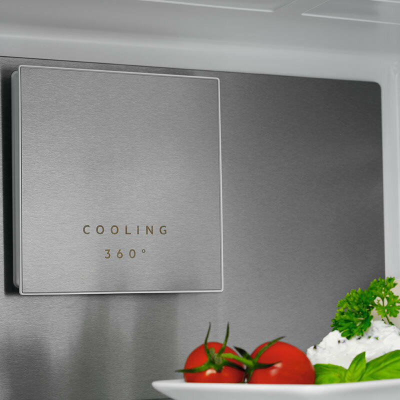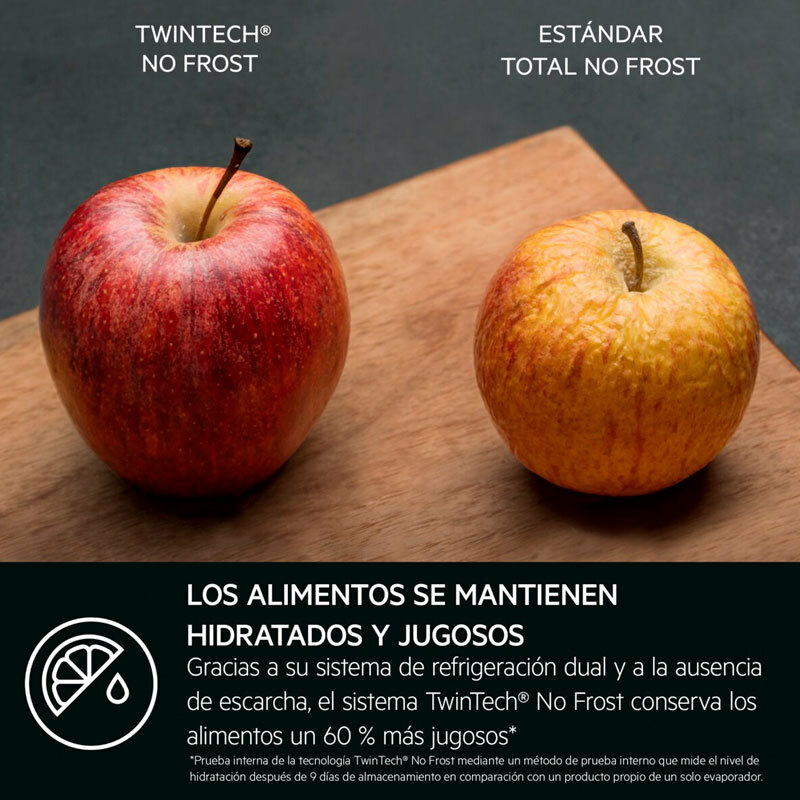 Refrigerando cada rincón. Todo el sabor en cada bocado Protege tus ingredientes en cualquier rincón con Cooling 360°. La circulación de aire refrigera cada esquina mediante salidas de aire eficientes. La innovadora parte posterior de acero inoxidable restaura las temperaturas rápidamente después de que se abra la puerta. Para un producto delicioso. - Cada rincón. Bien frío. Con Cooling 360° Cooling 360° tiene una avanzada circulación de aire. Su diseño especial hace circular el aire frío a cada rincón. La parte trasera de acero inoxidable y diseño premium enfría más rápido tras cada apertura de puerta. Protege con confianza la rica textura de cada ingrediente. - TwinTech® Total No Frost: conserva los alimentos jugosos e hidratados: TwinTech® Total No Frost tiene un avanzado sistema de refrigeración dual para el frigorífico y el congelador. Esta tecnología garantiza que el congelador se mantenga sin escarcha y la humedad del frigorífico sea óptima, evitando que los alimentos se sequen. - Diseño premium, para cocinas premium: El diseño contemporáneo y de líneas puras de este frigorífico le dará a tu cocina un aire muy moderno, elegante y minimalista. La calidad de los materiales de su puerta plana hacen de este electrodoméstico el nuevo centro de atención en tu cocina. - Diez años de tranquilidad La garantía de diez años del compresor proporciona la máxima tranquilidad. La garantía incluye mano de obra, transporte, extracción y recarga de gas, mantenimiento general y costes de servicio.
