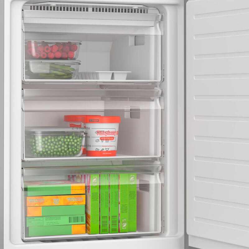 Tiradores verticales integrados: una línea continua de diseño. En Balay sabemos que hasta los pequeños detalles hay que cuidarlos. Por eso, los nuevos frigoríficos combinados de Balay Serie Cristal cuentan con tiradores verticales integrados, que van de arriba abajo, creando una línea continua de diseño sin elementos que sobresalgan. Todo lo necesario para que tu cocina sea elegante, cómoda y fácil de limpiar. - Iluminación LED: más durabilidad y eficiencia. No solo consumen poco, es que comparadas con una bombilla convencional consumen ¡hasta 10 veces menos! Y además duran más, de modo que el ahorro se multiplica. Si aún no lo ves claro, echa un vistazo al interior del frigorífico: los LED iluminan con claridad hasta el último rincón de forma progresiva, para permitir que la vista se adapte de forma natural y que ni un tomate cherry se quede olvidado al fondo del cajón. Además, los frigoríficos ExtraFresh Comfort disponen de una columna LED lateral. - Bandejas de cristal de seguridad Diseña tu propio espacio y congela todo lo que quieras. Podrás guardar todo tipo de alimentos en tu congelador, de cualquier tamaño y formato, gracias a la flexibilidad que aportan estas bandejas de cristal de seguridad, ubicadas entre los cajones. Si retiras uno o más cajones, puedes usarlas para apoyar copas de helado, cacerolas o cualquier otra cosa que necesite una superficie estable. Y si necesitas aún más espacio, puedes quitar las bandejas y tendrás un compartimento diáfano donde meter barras de pan enteras y otros alimentos de gran tamaño.