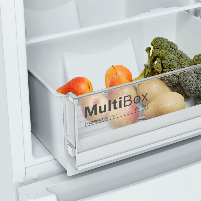 Cajón MultiBox de gran capacidad, con regulador de humedad para frutas y verduras Iluminación interior LED con efecto SoftStart 3 Estantes en el frigorífico de los cuales 2 regulables 3 Balcones en la puerta
