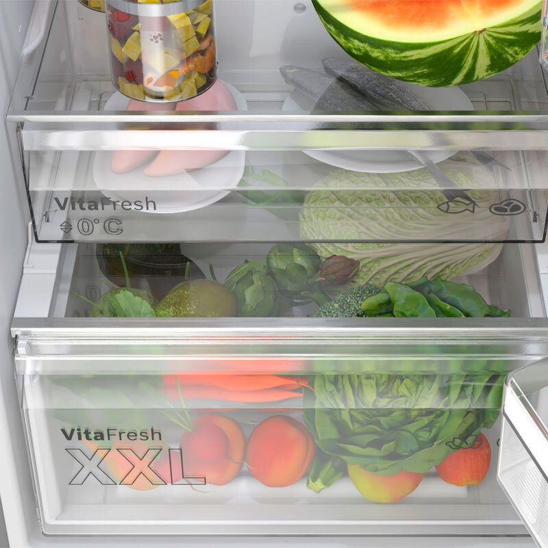 VitaFresh XXL 0 °C Espacio adicional para tus alimentos frescos. El espacioso sistema VitaFresh XXL 0 °C ofrece el entorno de almacenamiento ideal para los alimentos frescos. Mantiene una temperatura más baja para las carnes y pescados, y un cajón con mayor nivel de humedad que conserva las frutas y verduras perfectamente frescas. - Total No Frost Ni tendrás que descongelar, ni una gota verás. Con la tecnología Total No Frost, nunca más tendrás que descongelar tu congelador. Extrae la humedad y mantiene el aire seco, evitando que se forme escarcha en las paredes y en tus alimentos. Esto también es válido para el área del refrigerador. Di adiós a las gotas de agua y a la formación de hielo en la pared trasera, asegurando una perfecta conservación de todo lo que hay en su interior. Esto no solo te ahorra la molestia de descongelar y limpiar, sino que también hace que tu electrodoméstico sea más eficiente energéticamente. - Pared metálica y MultiAir Flow Una temperatura constante en todo el frigorífico. Cuando tu frigorífico mantiene una temperatura constante, los alimentos duran más tiempo en perfectas condiciones. Gracias a la pared trasera metálica con sistema MultiAir Flow, la humedad y la temperatura se distribuyen de forma uniforme por el interior, desde los compartimentos de la puerta hasta la parte trasera, para preservar mejor la comida. - Clase de ruido B (30-35 dB) Disfruta del silencio. No hay nada mejor que tener un momento de tranquilidad en la cocina. Nuestro frigorífico de clase de nivel de ruido B tiene un funcionamiento muy silencioso (30-35 dB) que no interfiere con tus actividades diarias. Disfruta de la conversación con la familia o los amigos o de un momento relajante en la cocina. Con nuestro frigorífico de clase de nivel de ruido B, lo único que oirás es el silencio. - Clase eficiencia energética C Ahorra energía. Nuestros frigoríficos con clase de eficiencia energética C ofrecen ahorro de energía junto con un buen rendimiento. Tus alimentos se mantendrán frescos a la vez que reduces tu factura de electricidad. Son la elección ideal si quieres un frigorífico de calidad que además sea energéticamente eficiente. - Congelación “Súper” Evita que los productos congelados se descongelen. Al introducir alimentos nuevos en el congelador, la temperatura interna aumenta, lo que puede producir descongelación y pérdida de sabor. La función de congelación “Súper” garantiza que los alimentos nuevos se congelen rápidamente y, de este modo, se evita que el resto del contenido se descongele. Los aparatos equipados con la función congelación “Súper” recuperan automáticamente su funcionamiento normal una vez alcanzada la temperatura necesaria, para no malgastar energía. Como resultado, los productos congelados mantienen su sabor incluso cuando se introducen alimentos nuevos. - Control independiente de la temperatura Conserva cada alimento a la temperatura ideal. Cada tipo de alimento, de la carne a la lechuga, requiere una temperatura de conservación distinta. Con el control independiente de la temperatura, puedes ajustar fácilmente la temperatura de cada zona de frigorífico y consultarla en la pantalla digital. Además, si tu frigorífico está vinculado con la aplicación Home Connect, puedes regular la temperatura de cada zona incluso cuando no estés en casa. ¡Eso sí que es flexibilidad! - Perfect Fit Pon el frigorífico donde quieras. Ahora puedes situar el frigorífico donde te vaya mejor.Los frigoríficos convencionales necesitan una distancia de unos 10 cm respecto a las paredes laterales para poder abrir las puertas y los cajones.En cambio, nuestra gama de frigoríficos-congeladores Perfect Fit pueden colocarse pegados a paredes y muebles.El frigorífico-congelador que se adapta a cualquier hueco. - Iluminación LED Disfruta de las mejores vistas de tu frigorífico. Con la iluminación LED, no perderás detalle del interior del frigorífico. Además de ahorrar energía, las luces LED proporcionan una iluminación intensa y uniforme de todo el interior, para que puedas ver a la perfección su contenido. Si tienes un frigorífico conectado, también puedes controlar la iluminación LED desde la aplicación Home Connect. Te permite encender o apagar la iluminación y ajustar la intensidad desde tu dispositivo móvil. Pásate a un frigorífico con iluminación LED y ten controlado todo el interior de un vistazo. - Doble circuito de frío Doble circuito de frío, máxima flexibilidad. En los frigoríficos con doble circuito de frío, puedes regular por separado la temperatura del compartimento del frigorífico y la del congelador. Ajusta la temperatura de cada compartimento mediante los controles electrónicos fáciles de usar. - Función refrigeración “Súper” El frigorífico que sabe mantener el frío. Con la función de refrigeración “Súper”, puedes bajar la temperatura del frigorífico durante un periodo de tiempo antes de ir a comprar. De esta forma, cuando introduzcas los alimentos en el frigorífico, alcanzarán rápidamente la temperatura adecuada. Solo tienes que pulsar un botón para bajar la temperatura hasta los 2 °C. Para que no tengas que estar pendiente, la función restablece automáticamente la refrigeración normal al cabo de 6-15 horas. Si dispones de un frigorífico conectado, también puedes activar la función refrigeración “Súper” desde la aplicación Home Connect. - Conservación VitaFresh XXL El cajón VitaFresh, con control de humedad regulable, mantiene la frescura de sus frutas y verduras por mucho más tiempo. El cajón VitaFresh, con control de humedad regulable, mantiene la frescura de sus frutas y verduras por mucho más tiempo.