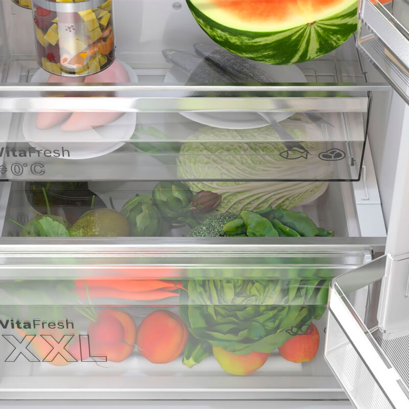 VitaFresh XXL 0 °C Espacio adicional para tus alimentos frescos. El espacioso sistema VitaFresh XXL 0 °C ofrece el entorno de almacenamiento ideal para los alimentos frescos. Mantiene una temperatura más baja para las carnes y pescados, y un cajón con mayor nivel de humedad que conserva las frutas y verduras perfectamente frescas. - Total No Frost Ni tendrás que descongelar, ni una gota verás. Con la tecnología Total No Frost, nunca más tendrás que descongelar tu congelador. Extrae la humedad y mantiene el aire seco, evitando que se forme escarcha en las paredes y en tus alimentos. Esto también es válido para el área del refrigerador. Di adiós a las gotas de agua y a la formación de hielo en la pared trasera, asegurando una perfecta conservación de todo lo que hay en su interior. Esto no solo te ahorra la molestia de descongelar y limpiar, sino que también hace que tu electrodoméstico sea más eficiente energéticamente. - Pared metálica y MultiAir Flow Una temperatura constante en todo el frigorífico. Cuando tu frigorífico mantiene una temperatura constante, los alimentos duran más tiempo en perfectas condiciones. Gracias a la pared trasera metálica con sistema MultiAir Flow, la humedad y la temperatura se distribuyen de forma uniforme por el interior, desde los compartimentos de la puerta hasta la parte trasera, para preservar mejor la comida. - Clase de ruido B (30-35 dB) Disfruta del silencio. No hay nada mejor que tener un momento de tranquilidad en la cocina. Nuestro frigorífico de clase de nivel de ruido B tiene un funcionamiento muy silencioso (30-35 dB) que no interfiere con tus actividades diarias. Disfruta de la conversación con la familia o los amigos o de un momento relajante en la cocina. Con nuestro frigorífico de clase de nivel de ruido B, lo único que oirás es el silencio. - Clase eficiencia energética C Ahorra energía. Nuestros frigoríficos con clase de eficiencia energética C ofrecen ahorro de energía junto con un buen rendimiento. Tus alimentos se mantendrán frescos a la vez que reduces tu factura de electricidad. Son la elección ideal si quieres un frigorífico de calidad que además sea energéticamente eficiente. - Congelación “Súper” Evita que los productos congelados se descongelen. Al introducir alimentos nuevos en el congelador, la temperatura interna aumenta, lo que puede producir descongelación y pérdida de sabor. La función de congelación “Súper” garantiza que los alimentos nuevos se congelen rápidamente y, de este modo, se evita que el resto del contenido se descongele. Los aparatos equipados con la función congelación “Súper” recuperan automáticamente su funcionamiento normal una vez alcanzada la temperatura necesaria, para no malgastar energía. Como resultado, los productos congelados mantienen su sabor incluso cuando se introducen alimentos nuevos. - Control independiente de la temperatura Conserva cada alimento a la temperatura ideal. Cada tipo de alimento, de la carne a la lechuga, requiere una temperatura de conservación distinta. Con el control independiente de la temperatura, puedes ajustar fácilmente la temperatura de cada zona de frigorífico y consultarla en la pantalla digital. Además, si tu frigorífico está vinculado con la aplicación Home Connect, puedes regular la temperatura de cada zona incluso cuando no estés en casa. ¡Eso sí que es flexibilidad! - Perfect Fit Pon el frigorífico donde quieras. Ahora puedes situar el frigorífico donde te vaya mejor.Los frigoríficos convencionales necesitan una distancia de unos 10 cm respecto a las paredes laterales para poder abrir las puertas y los cajones.En cambio, nuestra gama de frigoríficos-congeladores Perfect Fit pueden colocarse pegados a paredes y muebles.El frigorífico-congelador que se adapta a cualquier hueco. - Iluminación LED Disfruta de las mejores vistas de tu frigorífico. Con la iluminación LED, no perderás detalle del interior del frigorífico. Además de ahorrar energía, las luces LED proporcionan una iluminación intensa y uniforme de todo el interior, para que puedas ver a la perfección su contenido. Si tienes un frigorífico conectado, también puedes controlar la iluminación LED desde la aplicación Home Connect. Te permite encender o apagar la iluminación y ajustar la intensidad desde tu dispositivo móvil. Pásate a un frigorífico con iluminación LED y ten controlado todo el interior de un vistazo. - Doble circuito de frío Doble circuito de frío, máxima flexibilidad. En los frigoríficos con doble circuito de frío, puedes regular por separado la temperatura del compartimento del frigorífico y la del congelador. Ajusta la temperatura de cada compartimento mediante los controles electrónicos fáciles de usar. - Función refrigeración “Súper” El frigorífico que sabe mantener el frío. Con la función de refrigeración “Súper”, puedes bajar la temperatura del frigorífico durante un periodo de tiempo antes de ir a comprar. De esta forma, cuando introduzcas los alimentos en el frigorífico, alcanzarán rápidamente la temperatura adecuada. Solo tienes que pulsar un botón para bajar la temperatura hasta los 2 °C. Para que no tengas que estar pendiente, la función restablece automáticamente la refrigeración normal al cabo de 6-15 horas. Si dispones de un frigorífico conectado, también puedes activar la función refrigeración “Súper” desde la aplicación Home Connect. - Conservación VitaFresh XXL El cajón VitaFresh, con control de humedad regulable, mantiene la frescura de sus frutas y verduras por mucho más tiempo. El cajón VitaFresh, con control de humedad regulable, mantiene la frescura de sus frutas y verduras por mucho más tiempo.
