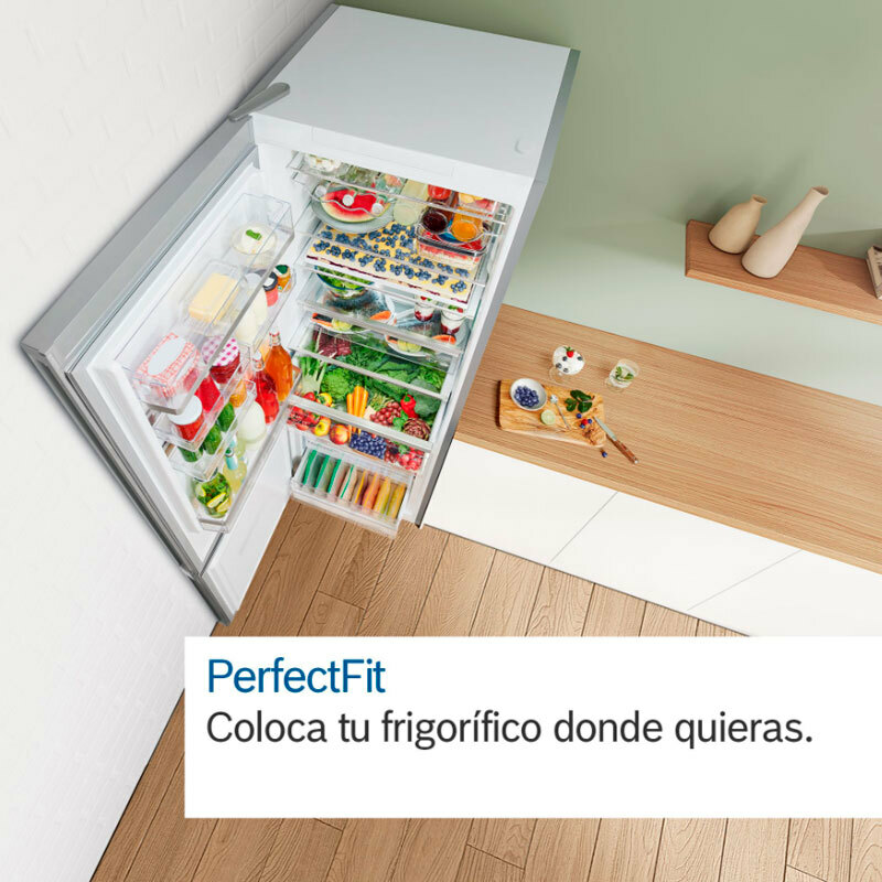 *¡¡Tecnología Inverter:!! La Tecnología Inverter ajusta continuamente la temperatura del frigorífico a las condiciones de temperatura del interior y el exterior.De esta manera, el compresor siempre funciona a la velocidad óptima, manteniendo estable la temperatura del frigorífico y mejorando su eficiencia. *¡¡VitaFresh XXL 0 °C:!! Espacio adicional para tus alimentos frescos. El espacioso sistema VitaFresh XXL 0 °C ofrece el entorno de almacenamiento ideal para los alimentos frescos. Mantiene una temperatura más baja para las carnes y pescados, y un cajón con mayor nivel de humedad que conserva las frutas y verduras perfectamente frescas. *¡¡Iluminación LED:!! Mejor iluminación, menor consumo. Iluminación fría, clara, de larga duración y mínimo consumo. Para que no pierdas detalle del interior de tu frigorífico. *¡¡Función “Super” Refrigeración:!! El frigorífico que sabe cómo mantener el frío. Activar la función Refrigeración “Super” antes de ir a la compra bajará la temperatura durante un corto período de tiempo, y preparará tu frigorífico para introducir gran cantidad de alimentos calientes o temperatura ambiente y mantenerla en las condiciones óptimas. *¡¡Perfect Fit:!! Pon el frigorífico donde quieras. Ahora puedes situar el frigorífico donde te vaya mejor.Los frigoríficos convencionales necesitan una distancia de unos 10 cm respecto a las paredes laterales para poder abrir las puertas y los cajones.En cambio, nuestra gama de frigoríficos-congeladores Perfect Fit pueden colocarse pegados a paredes y muebles.El frigorífico-congelador que se adapta a cualquier hueco.