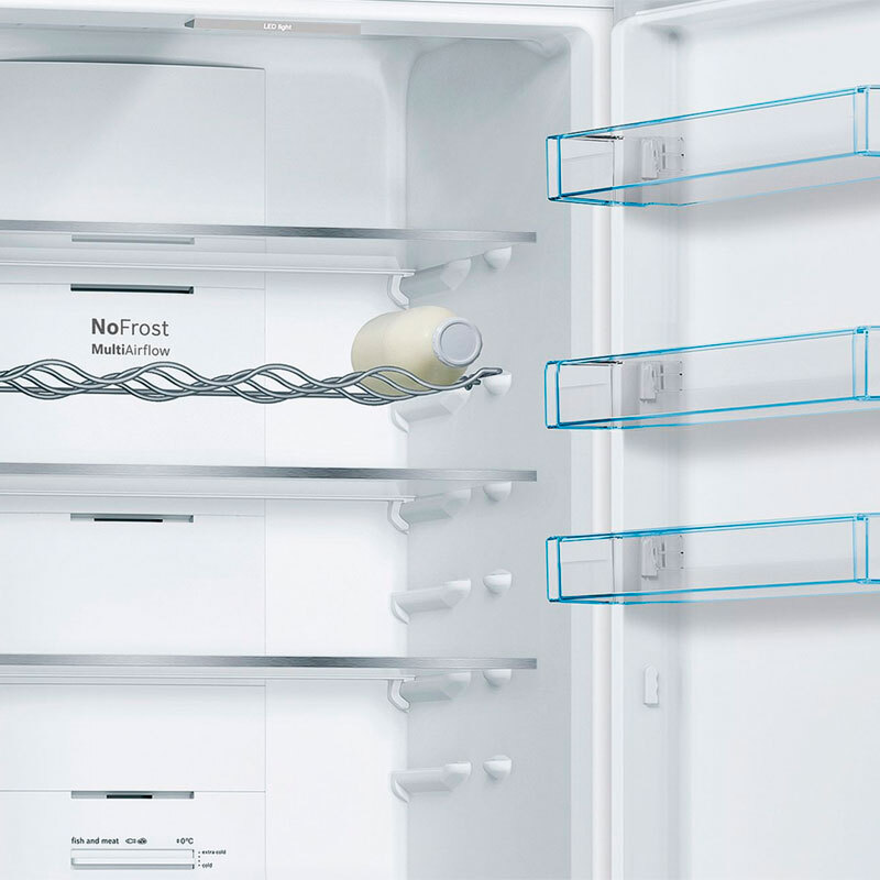 VitaFresh Conserva los alimentos frescos durante más tiempo. El sistema VitaFresh, con control de la humedad y la temperatura, ofrece el entorno ideal para conservar los alimentos frescos. El pescado y la carne se mantienen frescos durante más tiempo a una temperatura cercana a 0 °C.El entorno controlado mejora la conservación de las frutas y verduras. Mayor frescura y menos desperdicio de alimentos. - Total No Frost Ni tendrás que descongelar, ni una gota verás. Con la tecnología Total No Frost, nunca más tendrás que descongelar tu congelador. Extrae la humedad y mantiene el aire seco, evitando que se forme escarcha en las paredes y en tus alimentos. Esto también es válido para el área del refrigerador. Di adiós a las gotas de agua y a la formación de hielo en la pared trasera, asegurando una perfecta conservación de todo lo que hay en su interior. Esto no solo te ahorra la molestia de descongelar y limpiar, sino que también hace que tu electrodoméstico sea más eficiente energéticamente. - Perfect Fit Pon el frigorífico donde quieras. Ahora puedes situar el frigorífico donde te vaya mejor. Los frigoríficos convencionales necesitan una distancia de unos 10 cm respecto a las paredes laterales para poder abrir las puertas y los cajones. En cambio, nuestra gama de frigoríficos-congeladores Perfect Fit pueden colocarse pegados a paredes y muebles. El frigorífico-congelador que se adapta a cualquier hueco. - Zona easyAccess. Accede fácilmente al contenido del frigorífico. Cuando el frigorífico está repleto, a veces es difícil controlar todo lo que contiene. Nuestra Zona easyAccess está diseñada para que puedas ver todo el contenido del frigorífico de un vistazo. Solo tienes que extraer el estante para acceder fácilmente a lo que quieras. Este estante de cristal inastillable es fácil de extraer, para que encuentres rápidamente todo lo que buscas. - Alarma Puerta abierta No te dejes la puerta mal cerrada ¿Te suele pasar que te encuentras la puerta de tu frigorífico no está bien cerrada? ¿Quieres evitar perder frío y energía en el interior de tu frigorífico? Con la Alarma “Puerta abierta”, no te volverá a suceder. Una señal acústica o visual a traves de la luz te informará de que la puerta no está bien cerrada. - Congelación “Súper” Evita que los productos congelados se descongelen. Al introducir alimentos nuevos en el congelador, la temperatura interna aumenta, lo que puede producir descongelación y pérdida de sabor. La función de congelación “Súper” garantiza que los alimentos nuevos se congelen rápidamente y, de este modo, se evita que el resto del contenido se descongele. Los aparatos equipados con la función congelación “Súper” recuperan automáticamente su funcionamiento normal una vez alcanzada la temperatura necesaria, para no malgastar energía. Como resultado, los productos congelados mantienen su sabor incluso cuando se introducen alimentos nuevos. - Iluminación LED Disfruta de las mejores vistas de tu frigorífico. Con la iluminación LED, no perderás detalle del interior del frigorífico. Además de ahorrar energía, las luces LED proporcionan una iluminación intensa y uniforme de todo el interior, para que puedas ver a la perfección su contenido. Si tienes un frigorífico conectado, también puedes controlar la iluminación LED desde la aplicación Home Connect. Te permite encender o apagar la iluminación y ajustar la intensidad desde tu dispositivo móvil. Pásate a un frigorífico con iluminación LED y ten controlado todo el interior de un vistazo. - Estantes de cristal de seguridad: Más estabilidad y resistencia en las bandejas interiores. Todos nuestros estantes de seguridad están fabricados con vidrio reforzado para una mayor resistencia. Así puedes guardar en el frigorífico artículos especialmente pesados, como sandías y ollas grandes, con total seguridad. Además, son más fáciles de limpiar. - Doble circuito de frío Doble circuito de frío, máxima flexibilidad. En los frigoríficos con doble circuito de frío, puedes regular por separado la temperatura del compartimento del frigorífico y la del congelador. Ajusta la temperatura de cada compartimento mediante los controles electrónicos fáciles de usar. - Tecnología Inverter Control constante de la temperatura. La Tecnología Inverter ajusta continuamente la temperatura del frigorífico a las condiciones de temperatura del interior y el exterior. De esta manera, el compresor siempre funciona a la velocidad óptima, manteniendo estable la temperatura del frigorífico y mejorando su eficiencia. - Función refrigeración “Súper” El frigorífico que sabe mantener el frío. Con la función de refrigeración “Súper”, puedes bajar la temperatura del frigorífico durante un periodo de tiempo antes de ir a comprar. De esta forma, cuando introduzcas los alimentos en el frigorífico, alcanzarán rápidamente la temperatura adecuada. Solo tienes que pulsar un botón para bajar la temperatura hasta los 2 °C. Para que no tengas que estar pendiente, la función restablece automáticamente la refrigeración normal al cabo de 6-15 horas. Si dispones de un frigorífico conectado, también puedes activar la función refrigeración “Súper” desde la aplicación Home Connect. - Control independiente de la temperatura Conserva cada alimento a la temperatura ideal. Cada tipo de alimento, de la carne a la lechuga, requiere una temperatura de conservación distinta. Con el control independiente de la temperatura, puedes ajustar fácilmente la temperatura de cada zona de frigorífico y consultarla en la pantalla digital. Además, si tu frigorífico está vinculado con la aplicación Home Connect, puedes regular la temperatura de cada zona incluso cuando no estés en casa. ¡Eso sí que es flexibilidad! - Sustituye a KGN39VWDA