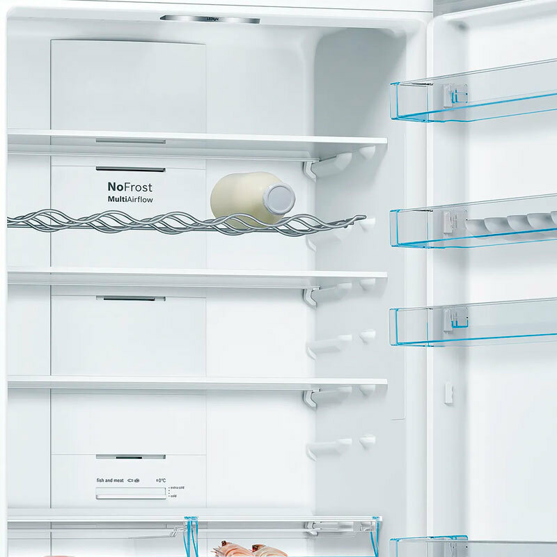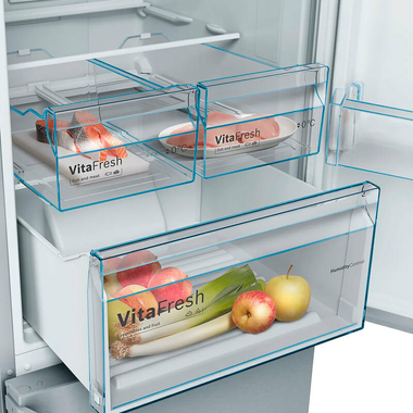 3 Cajones VitaFresh mantienen los alimentos frescos más tiempo en cajones a una temperatura cercana a los 0 °C - 5 Estantes en el frigorífico de los cuales 4 regulables en altura - Estante botellero - 3 Hueveras - 4 Balcones en la puerta
