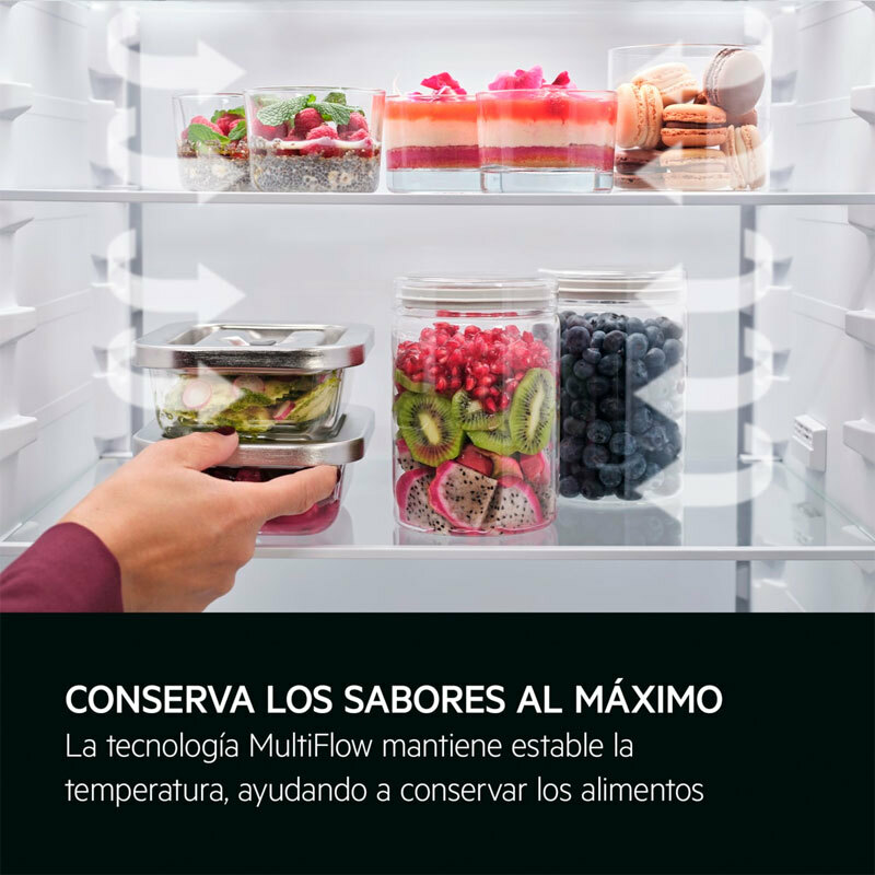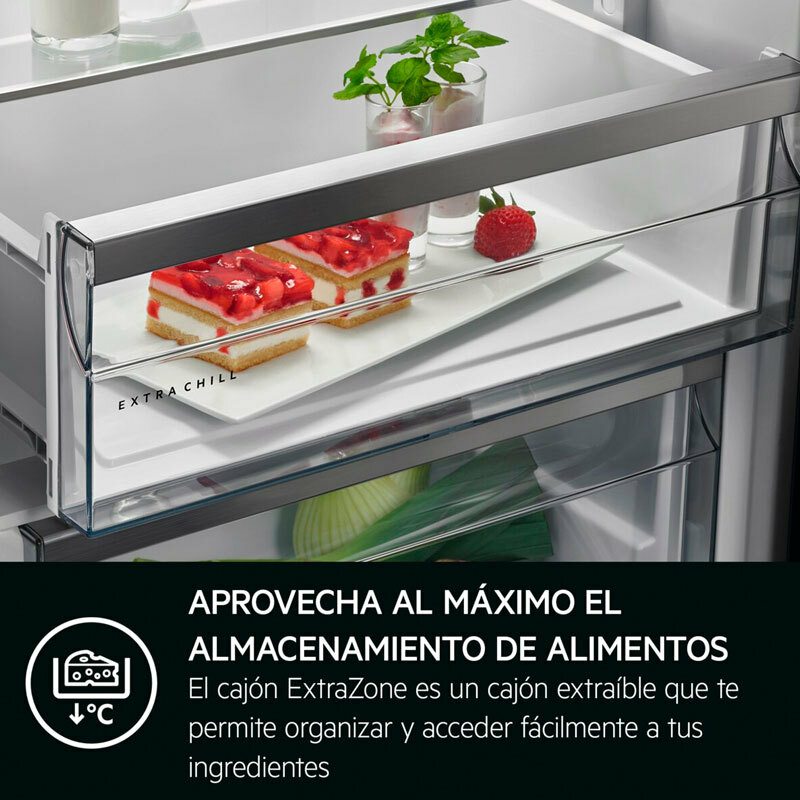 Mantiene los alimentos jugosos e hidratados: Los frigoríficos combi de la Serie 6000 TwinTech® Total No Frost protegen los sabores de los alimentos. Su doble sistema de refrigeración garantiza que el congelador se mantenga sin escarcha y la humedad del frigorífico sea óptima, evitando que los alimentos se sequen. - TwinTech® Total No Frost: conserva los alimentos jugosos e hidratados TwinTech® Total No Frost tiene un avanzado sistema de refrigeración dual para el frigorífico y el congelador. Esta tecnología garantiza que el congelador se mantenga sin escarcha y la humedad del frigorífico sea óptima, evitando que los alimentos se sequen. - Una nueva era en materia de innovación. Frigorífico combi único de plástico reciclado Ha llegado una nueva era de refrigeración. Presentamos nuestro frigorífico combi con revestimiento interior hecho con un 70 % de plástico reciclado. Se usa plástico de frigoríficos desechados para fabricar otros nuevos, lo que contribuye a reducir los residuos mediante la circularidad. - MultiFlow, temperatura estable en todo el compartimento frigorífico Mantén los alimentos tan frescos como cuando los compraste con un frigorífico MultiFlow. Una tecnología que hace circular el aire frío por todo el frigorífico para mantener una temperatura estable, conservando mejor los alimentos y evitando que se sequen. - Cajón Extra Chill, para alimentos frescos y delicados Ralentiza la maduración de tus quesos y embutidos favoritos guardándolos en el cajón del Extra Chill. La zona mantiene una temperatura más baja que el resto del frigorífico. - Alarma sonora en la puerta La alarma de la puerta te avisa si la puerta del aparato se deja abierta durante cierto tiempo, para que puedas cerrarla rápidamente.