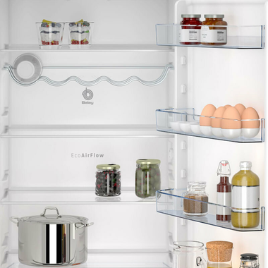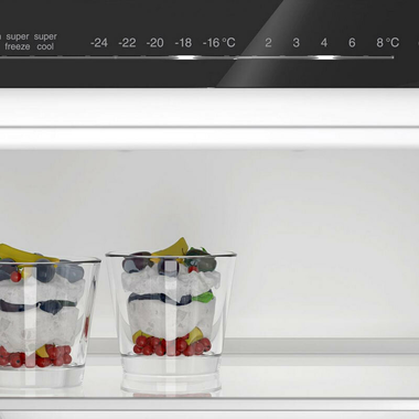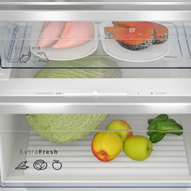 Cajón ExtraFresh de gran capacidad para frutas y verduras - Cajón ExtraCold Comfort 0°C para carnes y pescados. - Botellero cromado de gran capacidad - Bandejas de cristal de seguridad - Equipamiento interior con perfiles cromados