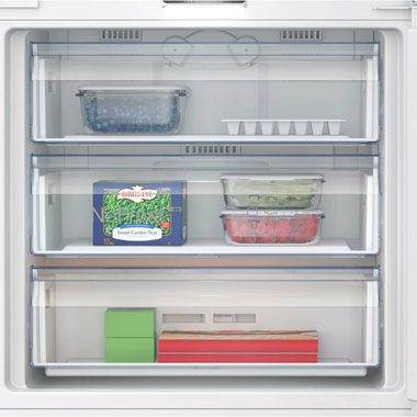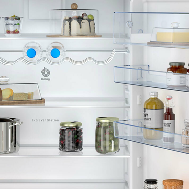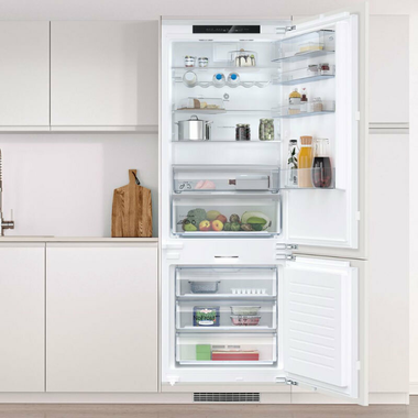 Cajón ExtraFresh de gran capacidad para frutas y verduras - Cajón ExtraCold 0°C para carnes y pescados - Soporte especial de acero para botellas - Balcón con tapa abatible en la puerta - Botellero cromado de gran capacidad - Bandejas de cristal de seguridad en el refrigerador - Equipamiento interior con perfiles cromados