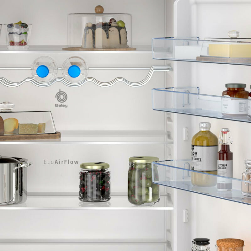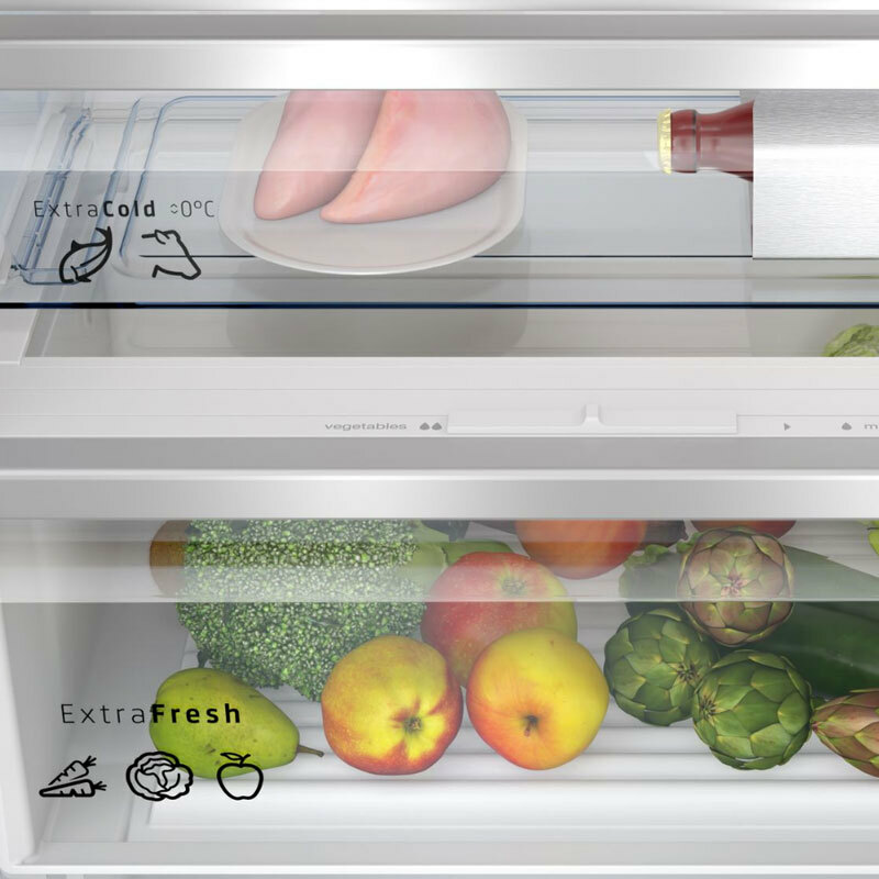 Cajón ExtraFresh de gran capacidad para frutas y verduras - Cajón ExtraCold 0°C para carnes y pescados - Soporte especial de acero para botellas - Botellero cromado de gran capacidad - Bandejas de cristal de seguridad - Equipamiento interior con perfiles cromados
