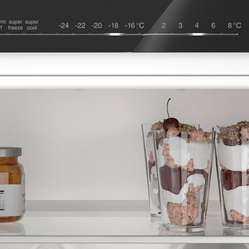 Cajón VitaFresh con regulador de humedad para frutas y verduras: regula la humedad en función del tipo de alimento Cajon VitaFresh 0º para carnes y pescados 5 bandejas de cristal de seguridad. 4 regulables en altura. 1 balcón grande, 3 balcones pequeños Botellero cromado