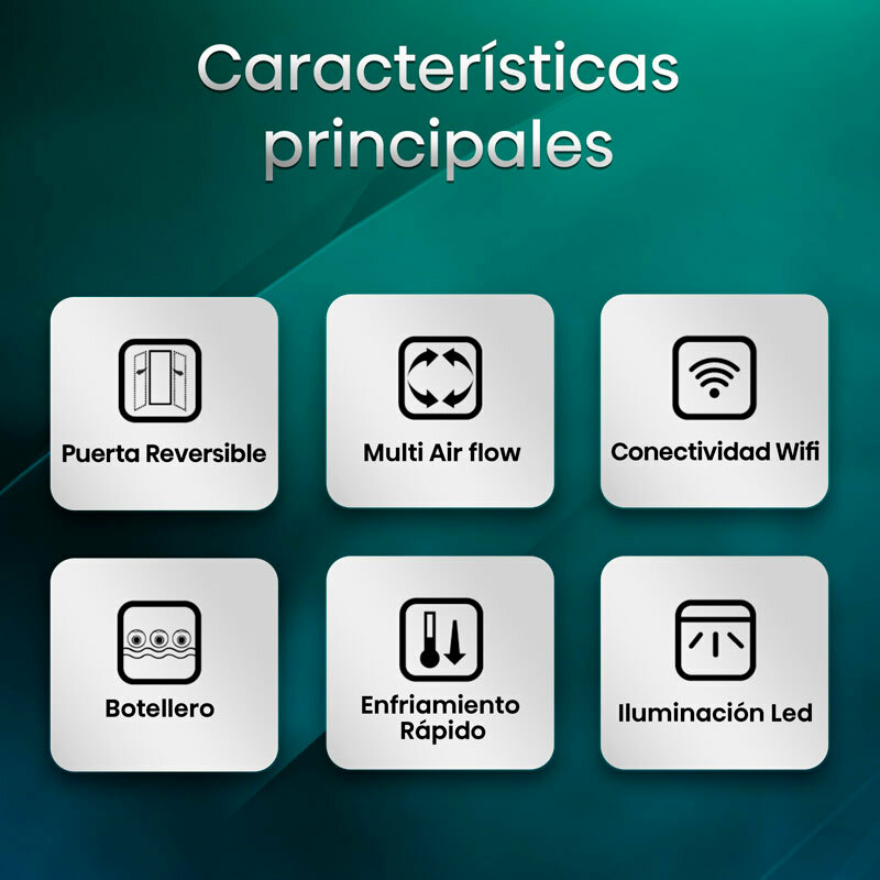 *¡¡Puerta Reversible:!! Diseño especial desarrollado para ofrecer flexibilidad de apertura hacia la izquierda o la derecha según cada necesidad. *¡¡Multi Air Flow:!! Tecnología que logra una distribución uniforme del frío, asegurando una temperatura óptima en cada rincón. Conserva perfectamente todos los alimentos. *¡¡Conectividad WiFi:!! Permite programar a distancia, revisar el ahorro energético y recibir notificaciones directamente en el teléfono. *¡¡Botellero:!! Espacio diseñado exclusivo para guardar botellas. Ahorra espacio y facilita la organización interior. *¡¡Enfriamiento Rápido:!! Reduce rápidamente la temperatura preservando los alimentos en óptimas condiciones. *¡¡Iluminación Led:!! Mayor visibilidad y menor consumo de energía utilizando tecnología LED que ilumina todo el interior