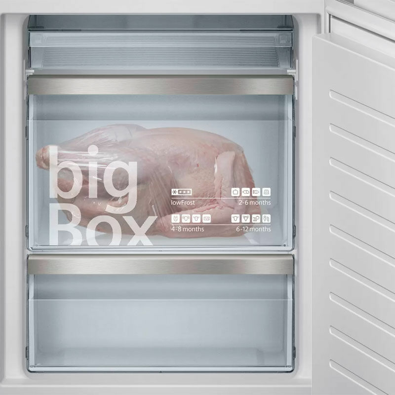 *Zona hyperFresh plus: conserva frutas y verduras frescas hasta el doble de tiempo. *Fácil descongelación con lowFrost. *Cajón bigBox XXL: ofrece más espacio para congelar grandes cantidades de alimentos con total seguridad. *Bandejas de cristal extensibles: facilitan la carga y permiten una mayor visibilidad de los alimentos.
