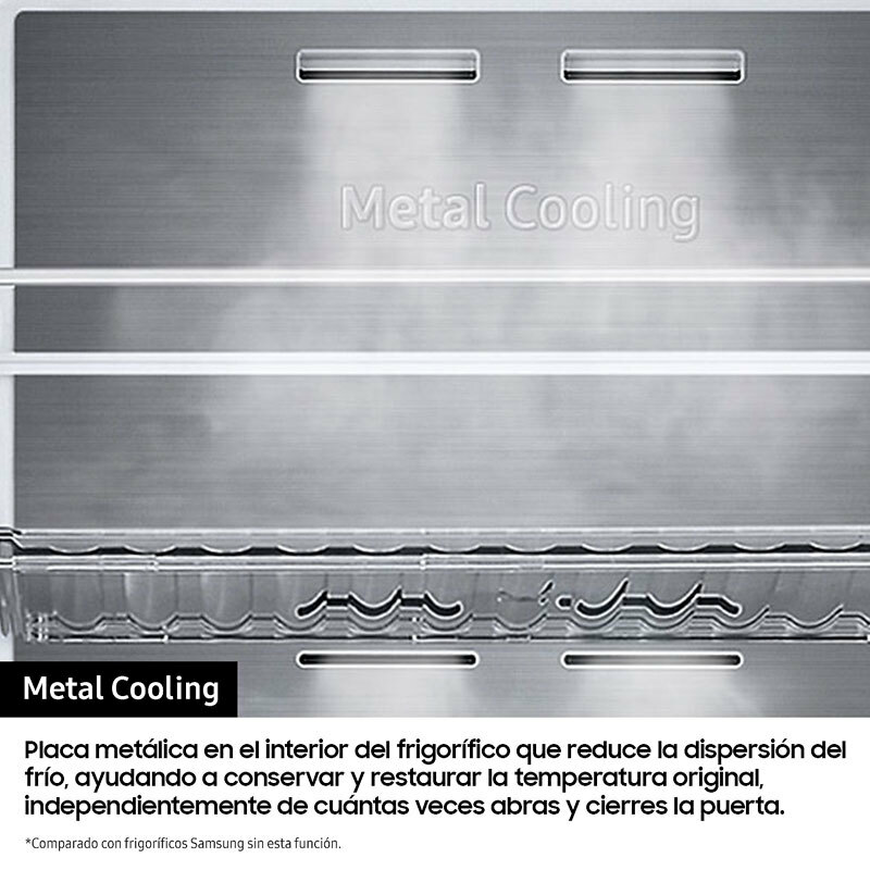 *¡¡ SmartThings AI Energy Mode:!! El AI Energy Mode analiza tu consumo de energía de forma diaria, semanal y mensual. Si tu factura supera el objetivo preestablecido, te ofrece la opción de ahorrar energía de forma proactiva (hasta en un 10%). Cuando esté activado optimizará de forma inteligente la velocidad del compresor y la frecuencia del ciclo de descongelación, en función de tus patrones de uso y del entorno *¡¡Twin Cooling Plus™:!! Esta tecnología, con su doble circuito de refrigeración, evita la mezcla de olores entre compartimentos y mantiene un nivel de humedad óptimo (entre el 65 y el 70%). Gracias a su refrigeración independiente, el aire frío circula por todos los rincones, logrando una temperatura constante que conserva los alimentos frescos por más tiempo. *¡¡Tecnología Cool Select+:!! Adapta tu frigorífico con 6 modos de temperatura, como el modo vacaciones, para ahorrar energía. Convierte el congelador en frigorífico con opciones como soft freeze (-5ºC), cold (-1ºC) y cool (2ºC). *¡¡SmartThings energy:!! Toma el control de tu consumo energético, reduce tu huella de carbono y ahorra dinero. SmartThings Energy te da consejos para ahorrar energía y monitoriza el consumo de tus electrodomésticos en tiempo real para compararlo con el del mes anterior y te avisa si tus objetivos mensuales se exceden. *¡¡SmartThings Home care:!! Cuidar tu frigorífico nunca fue tan fácil. SmartThings Home Care ofrece la posibilidad de monitorizarlo en tiempo real y recibir alertas: podrás comprobar cómo está funcionando o el estado del filtro de agua. Te notificará automáticamente si alguna pieza necesita reponerse o si detecta problemas. *¡¡Metal cooling:!! La placa metálica de refrigeración, ubicada en la parte trasera del frigorífico, minimiza la dispersión del frío y mantiene la temperatura, incluso si abres y cierras la puerta con frecuencia. El metal absorbe rápidamente el calor propio de los alimentos y ayuda a recuperar la temperatura interior. *¡¡Optimal Fresh+:!! El cajón independiente Optimal Fresh+ crea un ambiente ideal para conservar carne y pescado, manteniéndolos más frescos que el resto del frigorífico. Así, están frescos durante más tiempo y conservan su textura y sabor intactos. *¡¡No Frost:!! Olvídate de perder tiempo y energía descongelando el frigorífico. La tecnología No Frost mejora la circulación de aire para mantener una temperatura constante que previene la formación de hielo, alcanzando la temperatura óptima mucho más rápido y es menos exigente con el sistema de enfriamiento. *¡¡Power freeze:!! Congela alimentos y fabrica hielo en un momento. Con solo tocar un botón, la función Power Freeze ajusta automáticamente la temperatura del congelador en el nivel más bajo y libera aire frío de forma muy intensa para congelar o endurecer alimentos rápidamente o conseguir hielo en menos tiempo. *¡¡SpaceMax:!! Más espacio para los alimentos con un diseño optimizado. Samsung ha utilizado la tecnología de aislamiento más avanzada y fina para reducir el grosor de las paredes internas de este frigorífico, sin modificar su exterior. Disfruta de hasta 298 litros de capacidad neta, ideal para organizarlo todo. *¡¡Balda botellero:!! Espacio y flexibilidad para guardar tus bebidas y alimentos. Podrás almacenar vinos de tamaño estándar y también otras botellas grandes junto con cajas de diferentes tamaños en este híbrido entre balda y botellero. Tu refrigerador se convierte, así, en un lugar versátil y flexible.