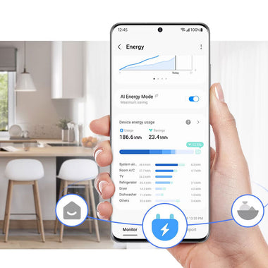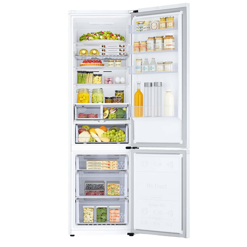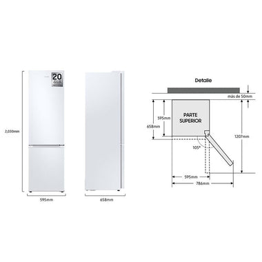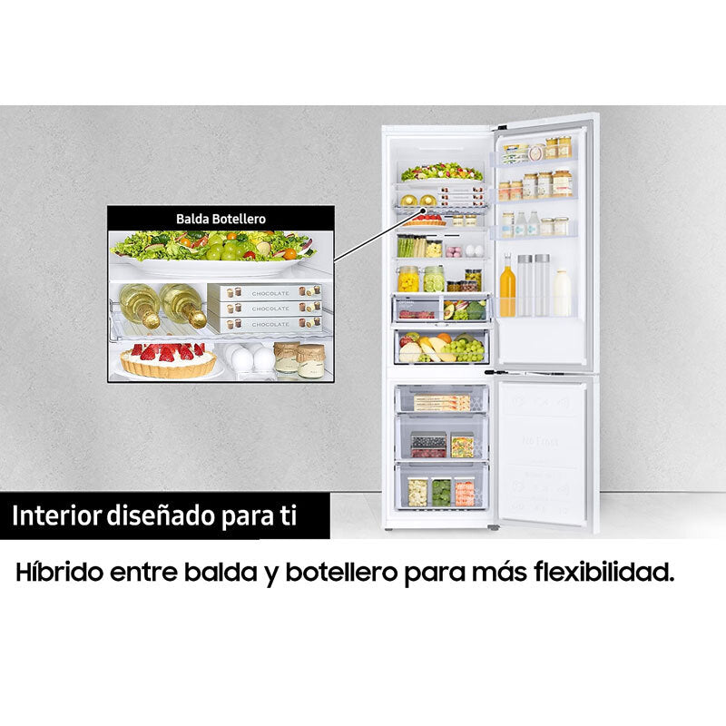 *¡¡Modo IA Energy & SmartThings:!! Ahorra hasta un 30% de energía gracias a la Inteligencia Artificial. Controla el consumo de energía, ahorra dinero y recibe consejos útiles. Toma el control de tu consumo energético, reduce tu huella de carbono y ahorra dinero. SmartThings Energy te da consejos para ahorrar energía y monitoriza el consumo de tus electrodomésticos en tiempo real para compararlo con el del mes anterior. También te avisa si tus objetivos mensuales se exceden. *¡¡SmartThings Home care:!! Cuidar tu frigorífico nunca fue tan fácil. SmartThings Home Care te ofrece la posibilidad de monitorizarlo en tiempo real y recibir alertas: podrás comprobar cómo está funcionando o el estado del filtro de agua. También te notificará automáticamente si alguna pieza necesita reponerse o si detecta problemas, te sugiere una solución. *¡¡SmartThings Cookling:!! Gestiona, compra y prepara tus alimentos con más eficiencia. SmartThings Cooking te permite crear una lista de los alimentos que hay en tu frigorífico y controlar las fechas de caducidad para que sepas en todo momento y lugar qué tienes y qué te falta. También te hace recomendaciones personalizadas *¡¡Ahorra al máximo gastando lo justo:!! Un producto eficiente es aquel que te ayuda a consumir la energía que realmente necesitas, reduciendo el consumo energético y ayudando al planeta. Gasta menos en la factura de la luz con nuestros electrodomésticos más eficientes. *¡¡Compresor inverter 20 años de garantía:!! Ajusta automáticamente la temperatura y humedad entre 7 niveles según tus necesidades, lo que supone un ahorro energético y, además, cuenta con 20 años de garantía. *¡¡Spacemax:!! Más espacio interior manteniendo el mismo tamaño exterior. Samsung ha reducido el grosor de las paredes maximizando la capacidad interior alcanzando hasta 390 litros de capacidad. *¡¡All Aroung Cooling:!! Tus alimentos se enfriarán correctamente estén donde estén situados en el frigorífico. All-Around Cooling consigue que la temperatura se mantenga constante en cada balda. Esta tecnología comprueba constantemente la temperatura y hace que circule aire frío a través de las múltiples ranuras dispuestas *¡¡Optimal Fresh+:!! Disfruta de la libertad de almacenamiento. El cajón Optimal Fresh+ puede usarse como un solo cajón o separarse en dos zonas con diferentes temperaturas. El lado izquierdo está más frío, por lo que la carne y el pescado pueden mantenerse frescos el doble de tiempo *¡¡Humidity Fresh+:!! Preserva la textura y el sabor original de la comida perecedera durante más tiempo. En este cajón puedes ajustar la humedad simplemente girando el control. *¡¡Diseño premium:!! Dale a tu casa un toque elegante. Su profundidad estándar de 600mm se alineará completamente con tus armarios. Cuenta con unas puertas lisas y una parte trasera limpia. El interior tiene baldas tintadas en gris, un display oculto, un estante plano para vinos y cajas. *¡¡Flexibilidad en tu almacenamiento:!! Guarda botellas más grandes en la puerta para no desperdiciar espacio en los estantes gracias a uno más grande que te ayuda a almacenar de forma segura botellas grandes, cartones voluminosos y otras bebidas. Es genial si quieres acceder fácilmente a tus bebidas favoritas en cualquier momento. *¡¡Trasera de metal:!! Limpia la parte trasera de tu frigorífico de forma mucho más sencilla. Tiene una cubierta de seguridad completamente lisa para esconder las bobinas y cables. Da un aspecto ordenado, se limpia fácilmente y proporciona una mayor durabilidad. Evita que la suciedad se acumule alrededor de los componentes y los protege de golpes.