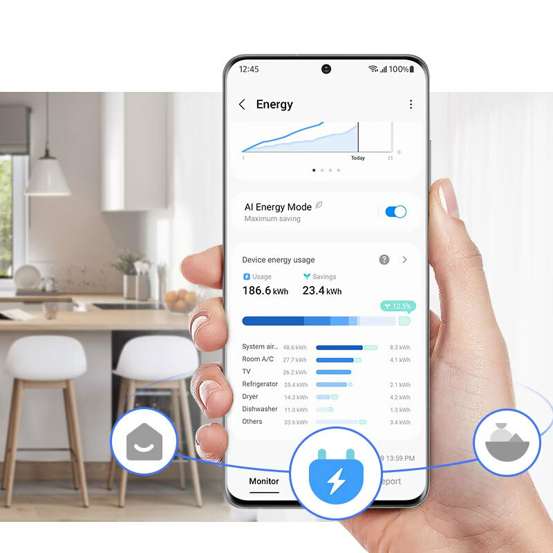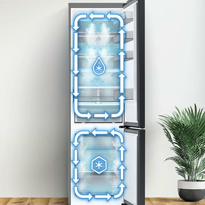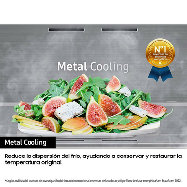 *¡¡Modo IA Energy & SmartThings:!! Ahorra hasta un 30% de energía gracias a la Inteligencia Artificial. Controla el consumo de energía, ahorra dinero y recibe consejos útiles. Toma el control de tu consumo energético, reduce tu huella de carbono y ahorra dinero. SmartThings Energy te da consejos para ahorrar energía y monitoriza el consumo de tus electrodomésticos en tiempo real para compararlo con el del mes anterior. También te avisa si tus objetivos mensuales se exceden. *¡¡SmartThings Home care:!! Cuidar tu frigorífico nunca fue tan fácil. SmartThings Home Care* te ofrece la posibilidad de monitorizarlo en tiempo real y recibir alertas: podrás comprobar cómo está funcionando o el estado del filtro de agua. También te notificará automáticamente si alguna pieza necesita reponerse o si detecta problemas, te sugiere una solución. *¡¡SmartThings Cooking:!! Gestiona, compra y prepara tus alimentos con más eficiencia. SmartThings Cooking* te permite crear una lista de los alimentos que hay en tu frigorífico y controlar las fechas de caducidad para que sepas en todo momento y lugar qué tienes y qué te falta. También te hace recomendaciones personalizadas *¡¡Ahorra al máximo gastando lo justo:!! Un producto eficiente es aquel que te ayuda a consumir la energía que realmente necesitas, reduciendo el consumo energético y ayudando al planeta. Gasta menos en la factura de la luz con nuestros electrodomésticos más eficientes. *¡¡Compresor Inverter con 20 años de garantía:!! Ajusta automáticamente la temperatura y humedad entre 7 niveles según tus necesidades, lo que supone un ahorro energético y, además, cuenta con 20 años de garantía *¡¡Twin Cooling plus:!! Esta tecnología optimiza la temperatura y la humedad tanto en el frigorífico como en el congelador con refrigeración independiente. Gracias al doble circuito de refrigeración, no se mezclan los olores y sabores entre compartimentos y mantiene un nivel de humedad óptimo (65% ~ 70%). Esto garantiza que los alimentos se mantengan más húmedos y frescos durante más tiempo. *¡¡Space Max:!! Almacena más alimentos en este frigorífico con un espacio interior de 387L de capacidad, manteniendo las medidas exteriores, que se ajusta a la perfección a tus muebles. La tecnología SpaceMax™ de aislamiento de alta eficiencia, permite que las paredes sean mucho más finas, lo que genera más espacio de almacenamiento sin ocupar más espacio del que dispones. *¡¡Metal Cooling:!! Gracias a la tecnología Metal Cooling mantendrás una temperatura óptima dentro del frigorífico para que tus alimentos estén siempre frescos. Una placa, una balda y un conducto plano metálicos reducen la dispersión del frío, ayudando a conservar y restaurar la temperatura original, independientemente de cuántas veces abras y cierres la puerta. Además, su aspecto es elegante y se limpia fácilmente. *¡¡Cool Select+:!! La zona Cool Select+ te ofrece la máxima flexibilidad de almacenaje, para que mantenga todos tus alimentos a la temperatura correcta. Con un solo toque, convierte el compartimento inferior tanto en frigorífico como en congelador. Elige entre 6 modos para adaptarlo a tus necesidades. *¡¡Humidity Fresh+:!! Preserva la textura, el sabor y los matices originales de los alimentos perecederos durante más tiempo. Puedes ajustar la humedad en el Cajón Humidity Fresh+ con solo girar la rueda de control dispuesta en la parte superior. Crea el ambiente perfecto para que distintas frutas y verduras se mantengan crujientes, jugosas y frescas. *¡¡Adáptalo a tus necesidades del momento:!! Bespoke es un frigorífico que se adapta a tu estilo de vida con un espacio interior personalizable. En la Balda botellero, más ancha y plana que los botelleros convencionales, puedes almacenar botellas o lo que tú quieras, como cajas de pizza. La Balda plegable en dos pasos, se desliza hacia dentro o fuera y se dobla a la mitad para dejar espacio para botellas altas y objetos voluminosos. *¡¡No frost:!! No malgastes tu tiempo y energía descongelando el frigorífico. La tecnología No Frost optimiza la circulación del aire para mantener una temperatura constante que previene la formación de hielo. También alcanza la temperatura adecuada mucho más rápido y hace trabajar menos al sistema de enfriamiento, por lo que durará más tiempo. *¡¡Power Cool y Power freeze:!! Disfruta de un enfriamiento más rápido. Con solo pulsar un botón, Power Cool expulsa de forma intensa aire frío dentro del frigorífico para enfriar rápidamente tus alimentos o bebidas favoritos. Power Freeze envía una ráfaga de aire frío al congelador, ideal para congelar o enfriar más los alimentos congelados o para hacer hielo. *¡¡Flexibilidad de almacenamiento:!! Almacena botellas más grandes, de hasta 2 litros, en la puerta para ahorrar espacio en las baldas gracias a las baldas de la puerta, que te ayudan a almacenar de forma segura botellas grandes, cartones voluminosos y otras bebidas. La forma más fácil e inteligente de coger tu bebida favorita siempre que quieras. *¡¡Trasera de metal:!! Limpia la parte trasera de tu frigorífico sin complicaciones. La cobertura protege las piezas internas y cables, además de ser completamente lisa. Su aspecto es impecable, muy fácil de limpiar y, además, añade durabilidad, ya que impide que la suciedad se acumule en las piezas y las protege de golpes.