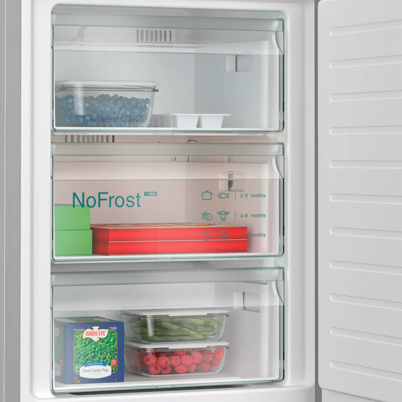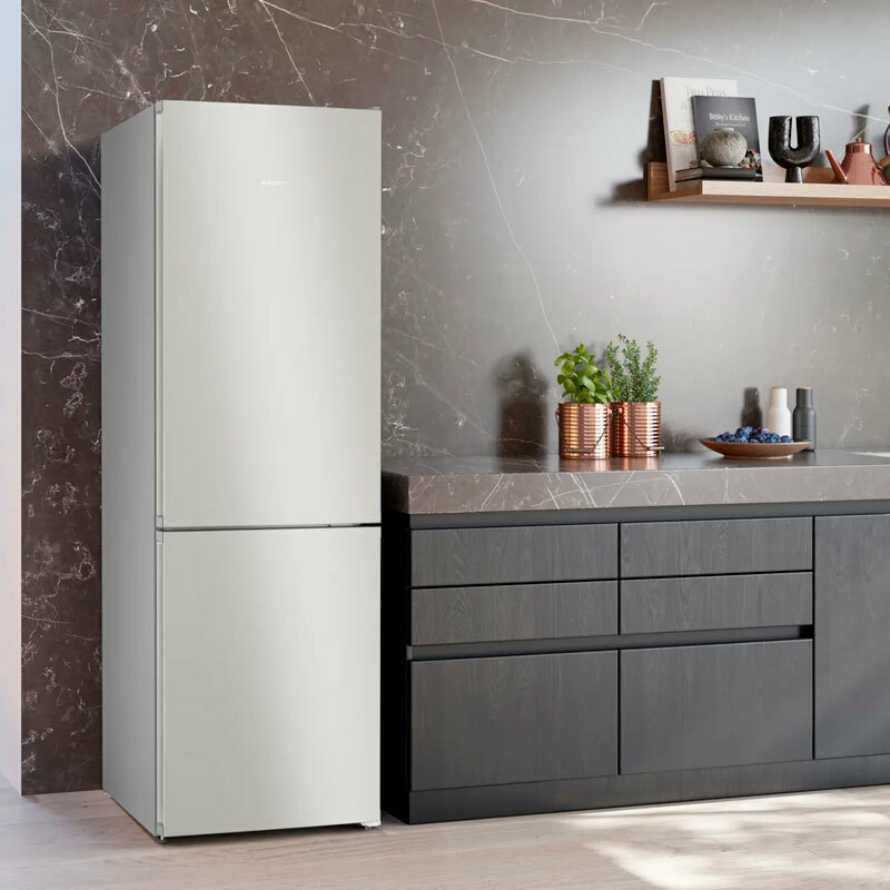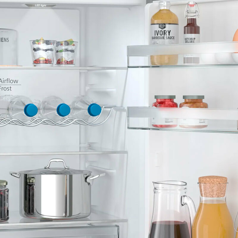 *Tecnología noFrost: No hay lugar para la escarcha en este frigorífico. Se acabó el descongelar el frigorífico para conservar correctamente los alimentos y no malgastar energía. La tecnología noFrost extrae la humedad y mantiene seco el aire dentro del frigorífico. Esto evita que se forme escarcha en las paredes interiores o los alimentos, para que no tengas que descongelarlo nunca. Además, ahorra energía, porque un congelador sin escarcha consume menos. *Pared trasera satinada con sistema multiAirflow: Todas las zonas del frigorífico enfrían igual. Para que los alimentos se conserven frescos, es necesario que todo el frigorífico enfríe igual. La pared posterior satinada con multiAirflow hace que el aire circule de manera uniforme para mantener una temperatura constante en todas las zonas. Los alimentos que acabas de meter en la nevera se enfrían rápidamente y la temperatura estable preserva su frescura. *hyperFresh 0 °C: Más espacio y más frescura. Llena tu nevera con todas las frutas y verduras que quieras. Y para las carnes y pescados, tienes un compartimento con su propio suministro de aire frío, que mantiene los alimentos en perfectas condiciones durante más tiempo. Más espacio y conservación ideal, en un mismo sistema. *Iluminación LED Premium: Perfecta visibilidad del interior de tu frigorífico. La iluminación LED permite una perfecta visibilidad del interior del frigorífico *Super-refrigeración: Enfría más rápidamente. Puedes utilizar la función “super-refrigeración” para reducir la temperatura del frigorífico hasta 2 ºC. Esta función permite un incremento extra de aire frío que ayuda a enfriar más rápidamente. Además, evita que la temperatura de los alimentos ya fríos aumente cuando se introducen nuevos productos a mayor temperatura