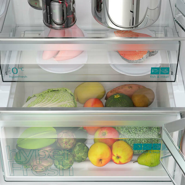 ["Cajón hyperFresh con regulador de humedad para frutas y verduras","Cajón hyperFresh 0°C para carnes y pescados","Iluminación interior mediante LED con softStart","Panel trasero interior con diseño blanco brillante","Bandejas de cristal EasyAccess con topes de seguridad antivuelco","1 Balcón grande","2 Balcones pequeños","Botellero cromado de gran capacidad"]
