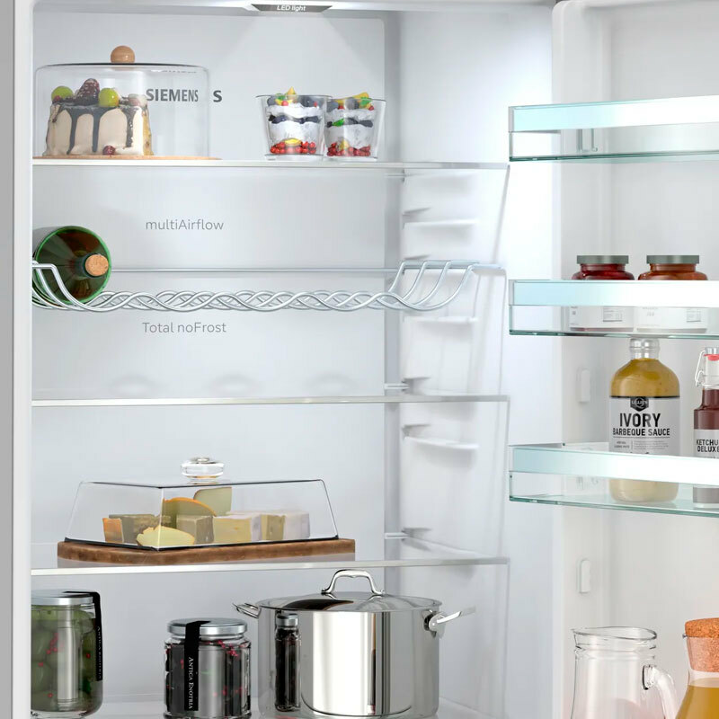 Congelador sin escarcha ni gotas en el frigorifico: Con la tecnología Total noFrost, olvídate de tener que descongelar tu congelador. Extrae la humedad y mantiene el aire seco, evitando la formación de escarcha en las paredes y tus alimentos. Esto también se aplica al área del frigorífico. La humedad y la formación de hielo ya no aparecerán en la pared trasera, manteniendo tus alimentos frescos. Esto no solo te ahorra el esfuerzo de descongelar, sino que también hace que tu electrodoméstico sea más eficiente energéticamente. - Ahorra con la eficiencia energética A: Cuidar el planeta no está reñido con llevar un estilo de vida confortable. Si piensas de esta manera, entonces los electrodomésticos de bajo consumo son para ti. Antes de comprar, fíjate en la etiqueta energética, que ofrece información sobre el consumo de energía, el nivel de ruido y el rendimiento de cada aparato. En el caso de los frigoríficos, la clasificación de eficiencia energética va de la A a la G. En Siemens ofrecemos frigoríficos con la clase de eficiencia energética A, que además tienen un excelente rendimiento. De esta manera, no solo ahorras dinero, sino que también disfrutas de un frigorífico con todas las prestaciones. - Sistema hyperfresh 0ºC: Obtén el espacio que necesitas para guardar grandes cantidades de frutas y verduras.Además, hay un compartimento especial para la carne y el pescado que tiene su propio suministro de aire frío, de modo que aguantan en perfectas condiciones durante más tiempo. Más espacio y mejor organización en tu frigorífico. - Todas las zonas del frigorífico enfrían por igual: Para que los alimentos se conserven frescos, es necesario que todo el frigorífico enfríe igual. La pared posterior satinada con multiAirflow hace que el aire circule de manera uniforme para mantener una temperatura constante en todas las zonas. Los alimentos que acabas de meter en la nevera se enfrían rápidamente y la temperatura estable preserva su frescura. - Tu frigorífico como nunca antes lo has visto: Aunque el frigorífico esté lleno, no perderás nada de vista. La iluminación LED integrada de bajo consumo alumbra de forma uniforme el interior del frigorífico. De este modo, podrás ver todo el contenido y encontrar enseguida lo que buscas. Como las luces LED están situadas en la parte delantera, el contenido del frigorífico no impide la visión. Además, con la aplicación Home Connect, puedes encender y apagar la iluminación LED o ajustar su brillo en frigoríficos compatibles. - Más eficiencia, menos ruido y ahorro de energía: El compresor con tecnología Inverter ajusta la temperatura del frigorífico según las condiciones del interior y el exterior. Funciona constantemente a la velocidad óptima para mantener los alimentos a la temperatura ideal y ofrecer un rendimiento estable y eficaz. - Mantén el frío en su lugar: ¿A veces olvidas comprobar que has cerrado bien la puerta del frigorífico? ¿O simplemente te gusta observar con calma lo que hay dentro? Si la puerta permanece abierta o entre abierta, la alarma de puerta te recordará que la cierres para que no se desperdicie el frío ni consumas energía innecesariamente. Si tu frigorífico cuenta con Home Connect, también recibirás una notificación en tu móvil a través de la aplicación. - Acero antihuellas: Las superficies de acero inoxidable de alta calidad de los frigoríficos tienen un acabado especial antihuellas que permite la fácil limpieza de la puerta para que siempre esté perfecta. - Control independiente de temperatura: ¿No sería genial ahorrar energía a la vez que conservas a la perfección tus alimentos? Ahora puedes controlar por separado la temperatura del frigorífico y la del congelador, a tu gusto. Te ofrece la flexibilidad que necesitas para mantener la temperatura ideal y ahorrar energía. - Instalación sin restricciones: ¿Quieres un diseño de cocina sin fisuras según tus preferencias personales? Coloca tu combi de libre instalación junto a una pared o dentro de un nicho del mueble. No necesitas una distancia a un lado para que las puertas y los cajones se abran. Coloca tu combi Siemens sin restricciones.
