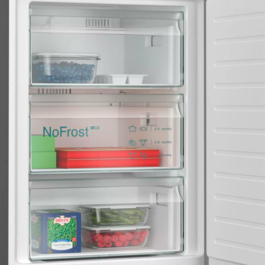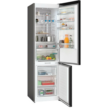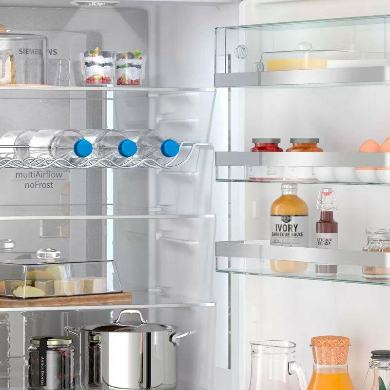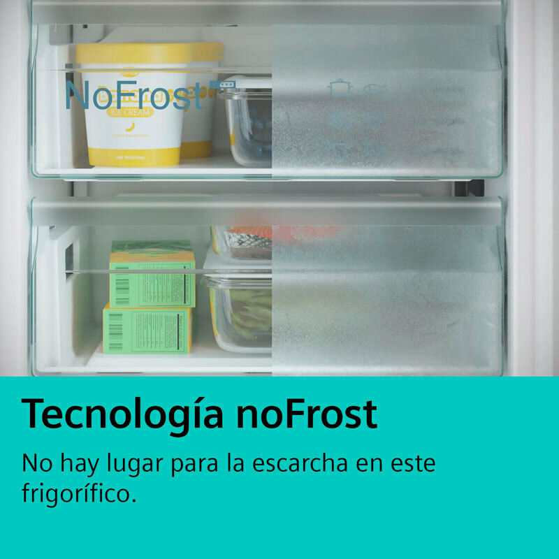 *Home Connect: Un frigorífico inteligente que te hace la vida más fácil. La aplicación Home Connect te permite controlar a distancia las funciones inteligentes de tu frigorífico. Por ejemplo, puedes activar el modo súper-congelación cuando estés en la compra o pasar al modo de vacaciones cuando te vayas de viaje. Qué buena idea *Tecnología noFrost: No hay lugar para la escarcha en este frigorífico. Se acabó el descongelar el frigorífico para conservar correctamente los alimentos y no malgastar energía. La tecnología noFrost extrae la humedad y mantiene seco el aire dentro del frigorífico. Esto evita que se forme escarcha en las paredes interiores o los alimentos, para que no tengas que descongelarlo nunca. Además, ahorra energía, porque un congelador sin escarcha consume menos. *Pared trasera metálica con sistema multiAirflow: Todos los alimentos se enfrían igual, estén donde estén. ¿Quieres asegurarte de que todas las partes de tu frigorífico enfrían igual? La pared trasera metálica con el sistema multiAirflow hace que el aire circule de manera uniforme dentro del frigorífico para que la temperatura sea constante en todos los niveles. Así, cuando metes alimentos en cualquier parte de la nevera, se enfrían rápidamente y se conservan frescos durante más tiempo. *hyperFresh 0 °C: Más espacio y más frescura. Llena tu nevera con todas las frutas y verduras que quieras. Y para las carnes y pescados, tienes un compartimento con su propio suministro de aire frío, que mantiene los alimentos en perfectas condiciones durante más tiempo. Más espacio y conservación ideal, en un mismo sistema. *Luz LED lateral en el frigorífico y luz LED en el congelador: El contenido de tu frigorífico y congelador sale a la luz. ¿Por qué a los alimentos más deliciosos les gusta esconderse en las profundidades del frigorífico o el congelador? El amplio LED lateral ilumina todo el interior del frigorífico con una luz brillante y sin sombras para encontrar lo que buscas a la primera. Además, el congelador cuenta con su propio sistema de luces LED, que ilumina directamente los cajones cuando están abiertos. Así puedes encontrar lo que buscas en segundos, en el frigorífico y el congelador. *Enfriador de botellas: Tus botellas, siempre frías. ¿Te gusta servir las bebidas a la temperatura perfecta? El enfriador de botellas es un estante metálico para guardar botellas y enfriarlas lo más rápidamente posible. La temperatura se mantiene cercana a los 0 °C, de modo que las botellas se enfrían rápidamente y están listas para servir en un momento. Solo tienes que sacar los vasos y disfrutar de tu bebida *Super-refrigeración: Enfría más rápidamente. Puedes utilizar la función “super-refrigeración” para reducir la temperatura del frigorífico hasta 2 ºC. Esta función permite un incremento extra de aire frío que ayuda a enfriar más rápidamente. Además, evita que la temperatura de los alimentos ya fríos aumente cuando se introducen nuevos productos a mayor temperatura.