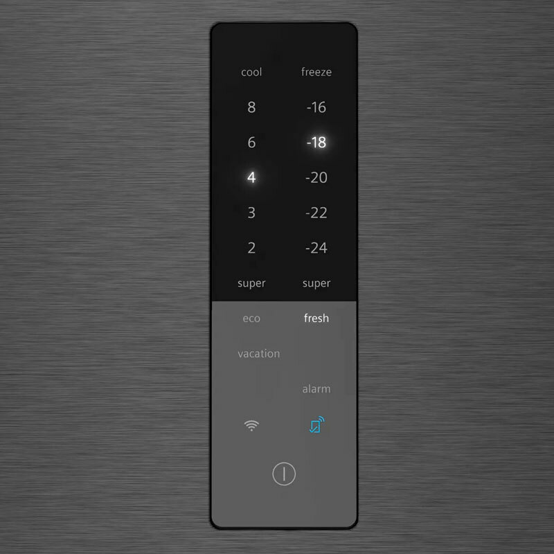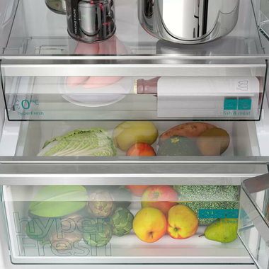 ["Cajón hyperFresh con regulador de humedad para frutas y verduras","Cajón hyperFresh 0°C para carnes y pescados","Panel trasero interior con diseño metalizado","Iluminación interior mediante LED con softStart","Bandejas de cristal EasyAccess con topes de seguridad antivuelco","Botellero cromado de gran capacidad","Accesorio soporte de bebidas","1 Balcón grande","2 Balcones pequeños","Mantequillera"]