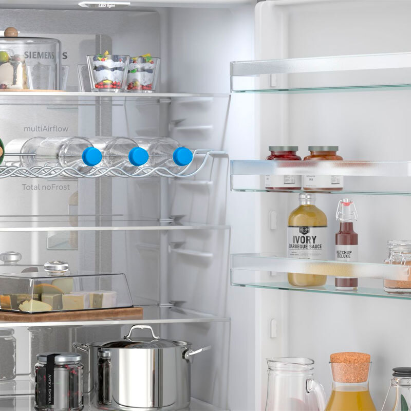 Más espacio y mejor conservación. Sistema hyperFresh <0°> Obtén el espacio que necesitas para guardar grandes cantidades de frutas y verduras.Además, hay un compartimento especial para la carne y el pescado que tiene su propio suministro de aire frío, de modo que aguantan en perfectas condiciones durante más tiempo. Más espacio y mejor organización en tu frigorífico. - Total noFrost Congelador sin escarcha, ni gota en tu frigorífico. Con la tecnología Total noFrost, olvídate de tener que descongelar tu congelador. Extrae la humedad y mantiene el aire seco, evitando la formación de escarcha en las paredes y tus alimentos. Esto también se aplica al área del frigorífico. La humedad y la formación de hielo ya no aparecerán en la pared trasera, manteniendo tus alimentos frescos. Esto no solo te ahorra el esfuerzo de descongelar, sino que también hace que tu electrodoméstico sea más eficiente energéticamente. - Pared trasera satinada con sistema multiAirflow Todas las zonas del frigorífico enfrían igual. Para que los alimentos se conserven frescos, es necesario que todo el frigorífico enfríe igual. La pared posterior satinada con multiAirflow hace que el aire circule de manera uniforme para mantener una temperatura constante en todas las zonas. Los alimentos que acabas de meter en la nevera se enfrían rápidamente y la temperatura estable preserva su frescura. - Alarma de puerta abierta Mantén el frío donde corresponde: dentro. ¿Alguna vez olvidas cerrar la puerta del frigorífico o crees que has cerrado correctamente pero no? Gracias a la alarma de puerta abierta, cuando pase unos segundos y la puerta no esté bien cerrada, te avisará para que la cierres correctamente. De esta forma evitas que la temperatura del interior aumente, consumes menos energía y conservas mejor los alimentos. Si tiene y está conectado a Home Connect, recibirás una notificación. - Súper congelación Congela más rápido, conserva mejor. ¿Has hecho la compra semanal y quieres que los nuevos alimentos se congelen rapidamente? Con Súper Congelación, tu congelador baja a la temperatura mínima, logrando que los alimentos recién añadidos se congelen rápidamente mientras los ya congelados se mantienen en perfectas condiciones, y tras ello se desactiva. Lo perfecto sería activar esta función entre 4-6 horas antes de añadir los nuevos alimentos para congelar. Puedes hacerlo directamente en el producto o a través de la app Home Connect (si dispone de esta funcionalidad). - Instalación flexible Instala tu frigorífico sin distancia adicional. Los combis ofrecen una flexibilidad añadida en su instalación ya que es posible instalarlos en un nicho o entre muebles sin necesidad de dejar una distancia adicional a lo que se indica en sus planos de instalación. - Iluminación LED Visualización perfecta del interior ¿Te gustaría ver todos y cada uno de los elementos que tienes en el interior del frigorífico de una manera clara y en un vistazo? Gracias a la iluminación LED clara y eficiente es posible. Ubicada en la parte frontal, permite que nada la obstaculice y poder ver hasta el último rincón. Además, si tu electrodoméstico tiene Home Connect, puedes encender y apagar la luz LED o ajustar su brillo e intensidad desde la app Home Connect. - Super-refrigeración Enfría rápido, conserva mejor. Enfriar rápidamente los alimentos frescos es la mejor garantía para conservar su frescura y sabor. La función de super-refrigeración está pensada precisamente para eso. Con solo tocar un botón, reduce la temperatura para enfriar rápidamente los productos frescos que metas en el frigorífico. De esta forma, mantienen todas sus propiedades hasta que los necesites para cocinar. También puedes activar la función de super-refrigeración a distancia si tienes un frigorífico conectado mediante la aplicación Home Connect. Por ejemplo, cuando estás volviendo de la compra y vas a introducir nuevos alimentos en el frigorífico. - Control independiente de la temperatura El control independiente de la temperatura te da más flexibilidad. ¿No sería genial ahorrar energía a la vez que conservas a la perfección tus alimentos?Ahora puedes controlar por separado la temperatura del frigorífico y la del congelador, a tu gusto.Te ofrece la flexibilidad que necesitas para mantener la temperatura ideal y ahorrar energía. - Tecnología Multi Airflow Enfriamiento uniforme, en todo momento. En los frigoríficos convencionales, la temperatura no es igual en todas las zonas. Sin embargo, con el sistema Multi Airflow, no tendrás que preocuparte por las fluctuaciones de temperatura. Distribuye aire frío por todo el interior, lo que garantiza unas condiciones uniformes de humedad y temperatura. De este modo, puedes colocar los alimentos en cualquier parte del frigorífico y se conservarán igual de bien. - Bandejas de cristal Bandejas resistentes y fáciles de limpiar. Las bandejas de vidrio están hechos de material de seguridad extra fuerte y fácil de limpiar. Si se derrama algo, gracias a los perfiles el líquido se retiene, evitando que se extienda a otras áreas del frigorífico. Disfruta de la tranquilidad de tener un refrigerador siempre limpio y seguro. - Compresor con tecnología Inverter Más eficiencia, menos ruido y ahorro de energía. El compresor con tecnología Inverter ajusta la temperatura del frigorífico según las condiciones del interior y el exterior. Funciona constantemente a la velocidad óptima para mantener los alimentos a la temperatura ideal y ofrecer un rendimiento estable y eficaz. - 15 años de piezas de repuesto Tu electrodoméstico ha venido para quedarse. Estamos comprometidos en establecer relaciones sostenibles y duraderas. Por eso, ofrecemos hasta 15 años de disponibilidad para las piezas de repuesto. Por eso, si algo se tuerce, te ofrecemos las piezas necesarias para que tu electrodoméstico pueda volver a funcionar sin problemas. Queremos que tus electrodo