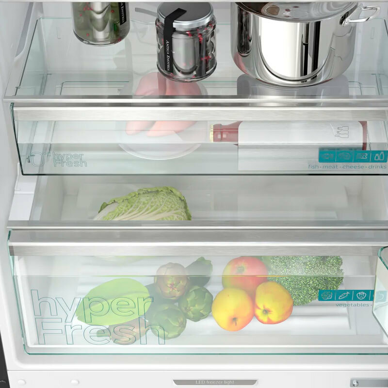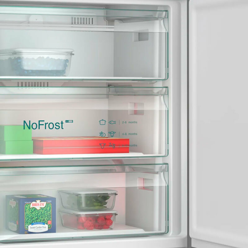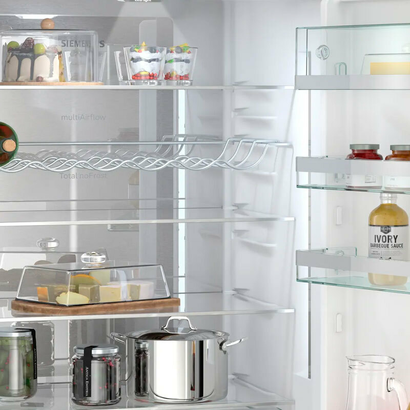 Congelador sin escarcha ni gotas en el frigorífico: Con la tecnología Total noFrost, olvídate de tener que descongelar tu congelador. Extrae la humedad y mantiene el aire seco, evitando la formación de escarcha en las paredes y tus alimentos. Esto también se aplica al área del frigorífico. La humedad y la formación de hielo ya no aparecerán en la pared trasera, manteniendo tus alimentos frescos. Esto no solo te ahorra el esfuerzo de descongelar, sino que también hace que tu electrodoméstico sea más eficiente energéticamente. - Sistema Hyperfresh 0ºC: Obtén el espacio que necesitas para guardar grandes cantidades de frutas y verduras.Además, hay un compartimento especial para la carne y el pescado que tiene su propio suministro de aire frío, de modo que aguantan en perfectas condiciones durante más tiempo. Más espacio y mejor organización en tu frigorífico. - Ahorra con la clase energética A: Cuidar el planeta no está reñido con llevar un estilo de vida confortable. Si piensas de esta manera, entonces los electrodomésticos de bajo consumo son para ti. Antes de comprar, fíjate en la etiqueta energética, que ofrece información sobre el consumo de energía, el nivel de ruido y el rendimiento de cada aparato. En el caso de los frigoríficos, la clasificación de eficiencia energética va de la A a la G. En Siemens ofrecemos frigoríficos con la clase de eficiencia energética A, que además tienen un excelente rendimiento. De esta manera, no solo ahorras dinero, sino que también disfrutas de un frigorífico con todas las prestaciones. - Todos los alimentos se enfrían por igual estén donde estén: ¿Quieres asegurarte de que todas las partes de tu frigorífico enfrían igual? La pared trasera metálica con el sistema multiAirflow hace que el aire circule de manera uniforme dentro del frigorífico para que la temperatura sea constante en todos los niveles. Así, cuando metes alimentos en cualquier parte de la nevera, se enfrían rápidamente y se conservan frescos durante más tiempo. - Encuentra fácilmente todo lo que hay en tu frigorífico y congelador: Se acabó rebuscar entre los estantes y cajones.¡Ahora lo tendrás todo a la vista! La iluminación LED lateral te permite ver todo lo que hay en el interior de tu frigorífico, sin que nada tape la luz. Y la iluminación LED en el congelador ofrece iluminación adicional al abrir los cajones del congelador.Encuentra enseguida lo que buscas en el frigorífico y el congelador. - Mantén las botellas bien frías: ¿Olvidaste meter la bebida en el frigorífico? No hay problema, porque el accesorio botellero de acero incluido garantiza que las bebidas se enfríen lo antes posible. Mantiene una temperatura cercana a los 0 °C, de modo que las botellas se enfrían rápidamente y están listas para servir en un momento. Disfruta de tu bebida tan fría como te gusta. - Mantén el frío en su lugar: ¿A veces olvidas comprobar que has cerrado bien la puerta del frigorífico? ¿O simplemente te gusta observar con calma lo que hay dentro? Si la puerta permanece abierta o entre abierta, la alarma de puerta te recordará que la cierres para que no se desperdicie el frío ni consumas energía innecesariamente. Si tu frigorífico cuenta con Home Connect, también recibirás una notificación en tu móvil a través de la aplicación. - Control independiente de la temperatura: ¿No sería genial ahorrar energía a la vez que conservas a la perfección tus alimentos? Ahora puedes controlar por separado la temperatura del frigorífico y la del congelador, a tu gusto. Te ofrece la flexibilidad que necesitas para mantener la temperatura ideal y ahorrar energía. - Tu frigorífico como nunca antes lo has visto: Aunque el frigorífico esté lleno, no perderás nada de vista. La iluminación LED integrada de bajo consumo alumbra de forma uniforme el interior del frigorífico. De este modo, podrás ver todo el contenido y encontrar enseguida lo que buscas. Como las luces LED están situadas en la parte delantera, el contenido del frigorífico no impide la visión. Además, con la aplicación Home Connect, puedes encender y apagar la iluminación LED o ajustar su brillo en frigoríficos compatibles. - Mucho espacio para almacenar todo lo que imagines: Los compartimentos grandes y la capacidad de almacenamiento extra, ofrece un espacio suficiente para toda la compra semanal gracias a su gran capacidad. Mantén tus opciones culinarias abiertas.